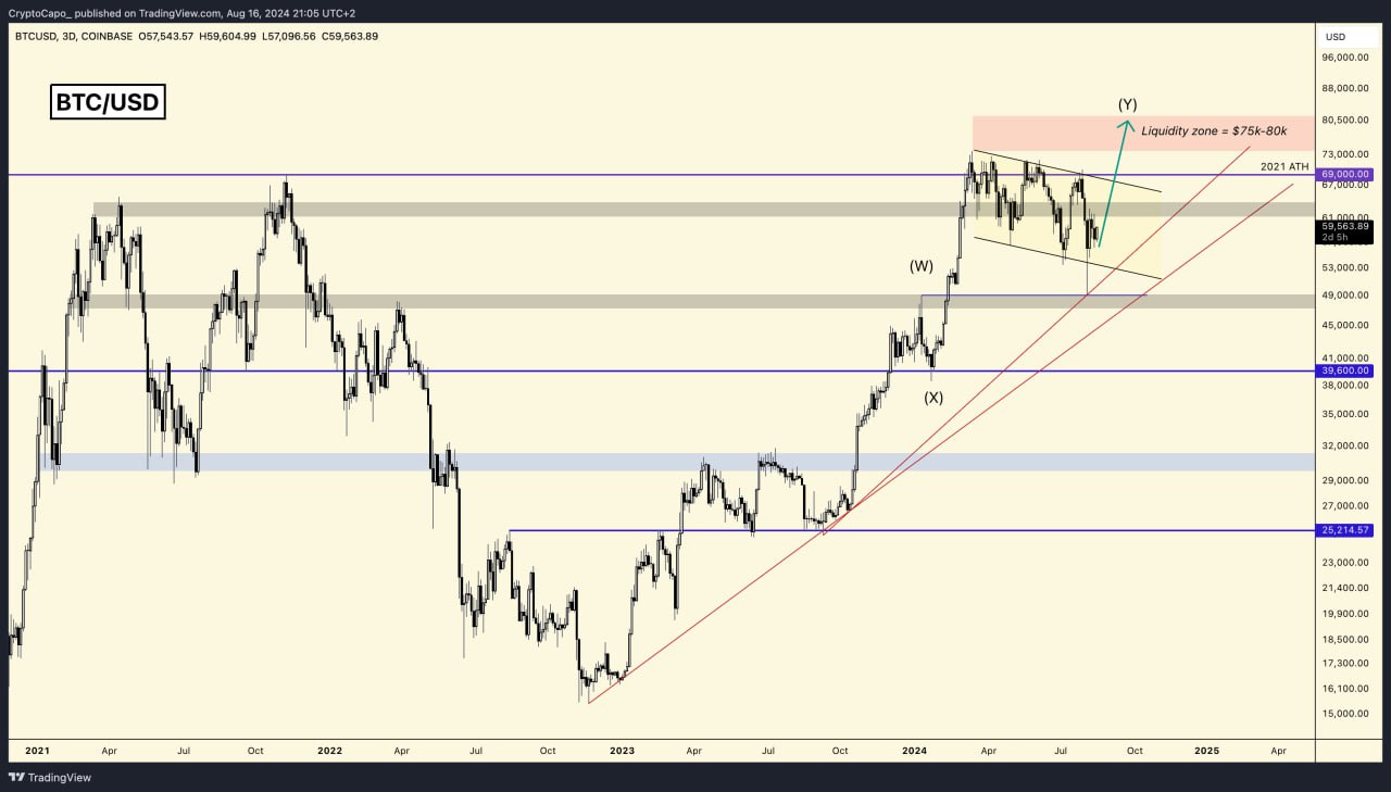 بالانتقال إلى البيتكوين (BTC)، يشاركنا Capo مخططًا يشير إلى أن ملك العملات المشفرة على استعداد للارتفاع إلى منطقة السيولة بين 75000 دولار و80000 دولار.
