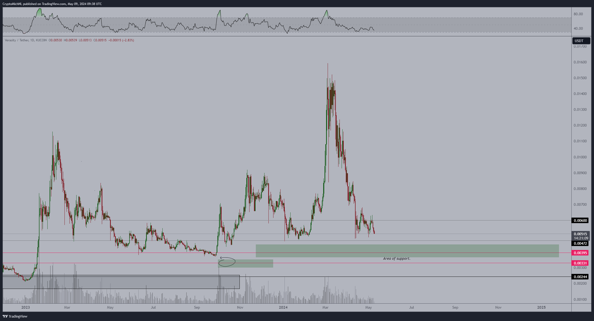 آخر عملة بديلة على رادار Van de Poppe هي الأصل الأصلي لـ Verasity (VRA) لمشاركة الفيديو. وفقًا للمحلل، فإن VRA في اتجاه هبوطي كامل وقد يجد الدعم عند 0.004 دولار