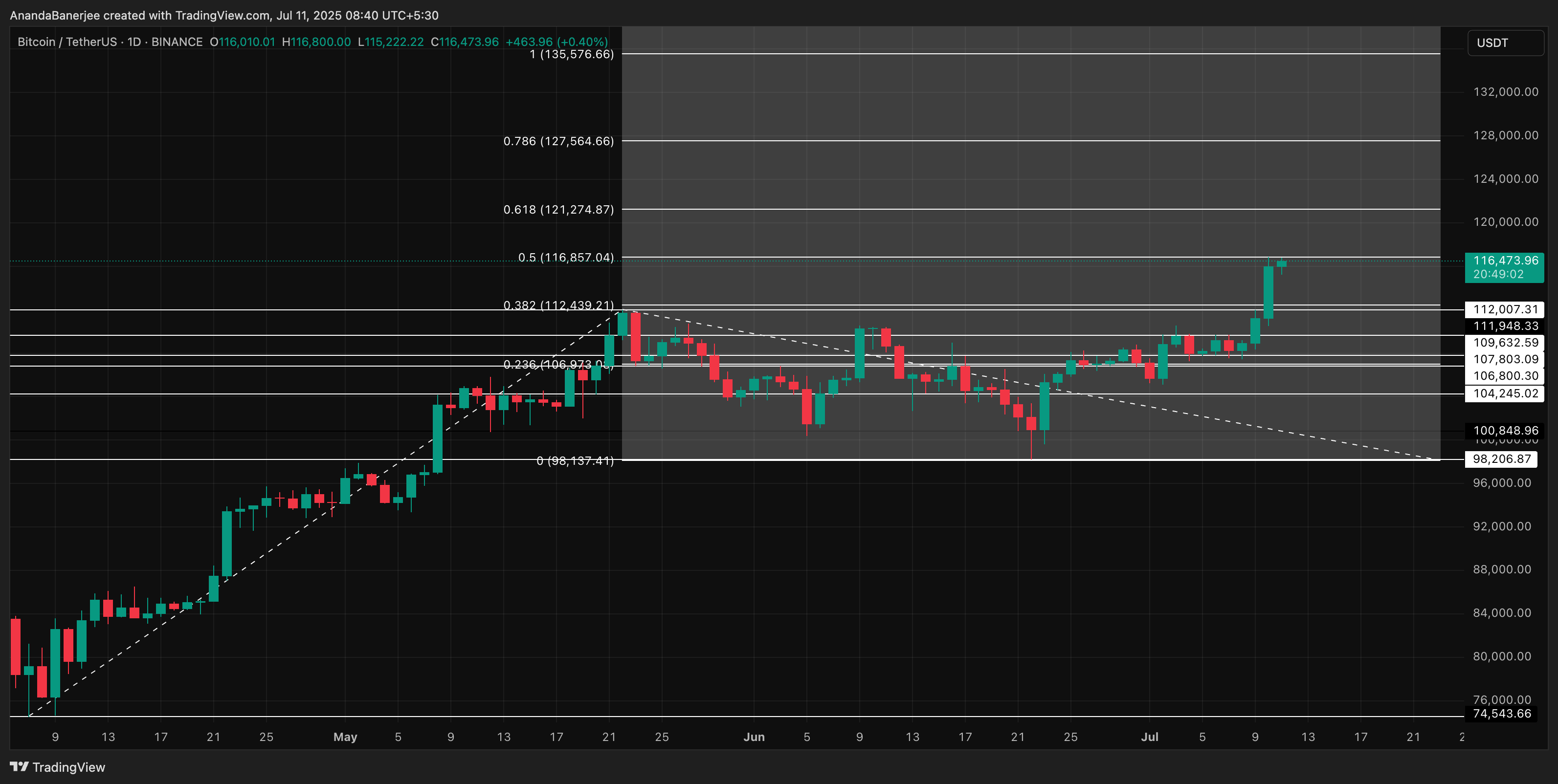 آخر فتيل Bitcoin بالقرب من 116،500 دولار يتوافق مع امتداد 0.5 Fibonacci ، مما يشير إلى أن سعر البيتكوين قد يتجاوز مستوى المقاومة هذا يمكن أن يفتح المسار نحو 121،000 دولار و 135000 دولار. تعمل هذه المستويات كدافع للاستمرار ، ولكن فقط إذا كان الزخم يحافظ.