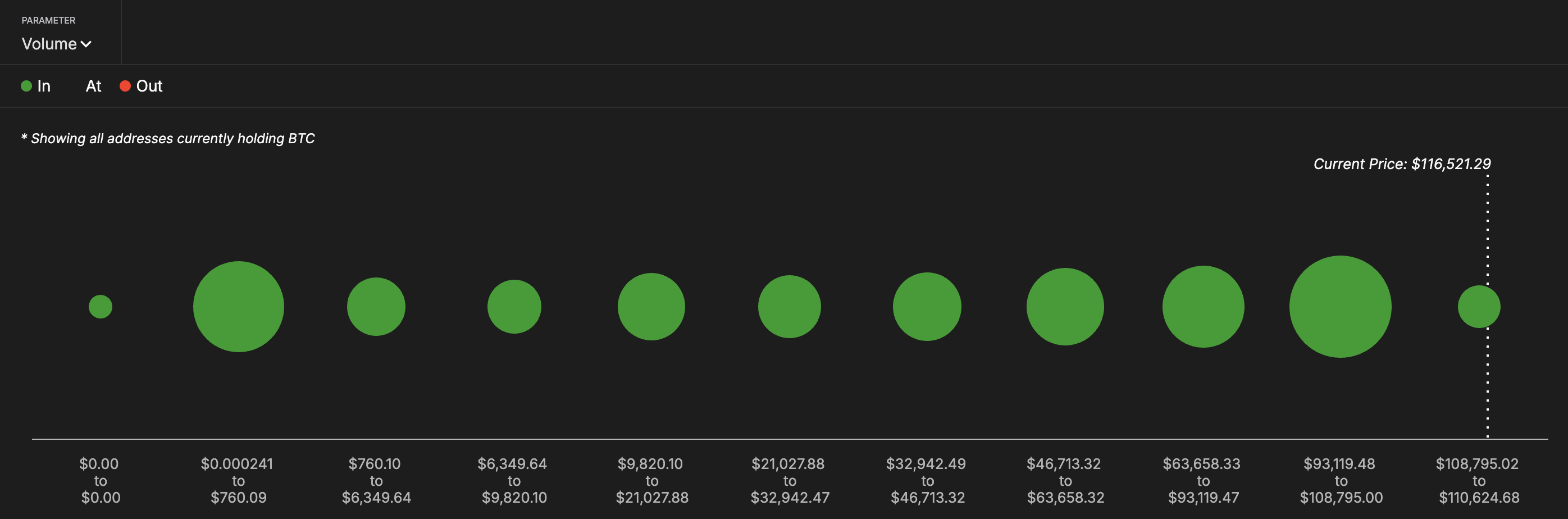 بعد ذلك ، لنتحدث عن الدفاع. وفقًا لـ IntotheBlock's In/Out Out Out Around Around Price (IOMAP) ، فإن أكثر من 645،000 عنوان تم شراؤها بين 108،795 دولار و 110،624 دولار. هذا هو 476.65K BTC القريبة من المستويات الحالية ، ويشكل جدار الطلب الرئيسي.