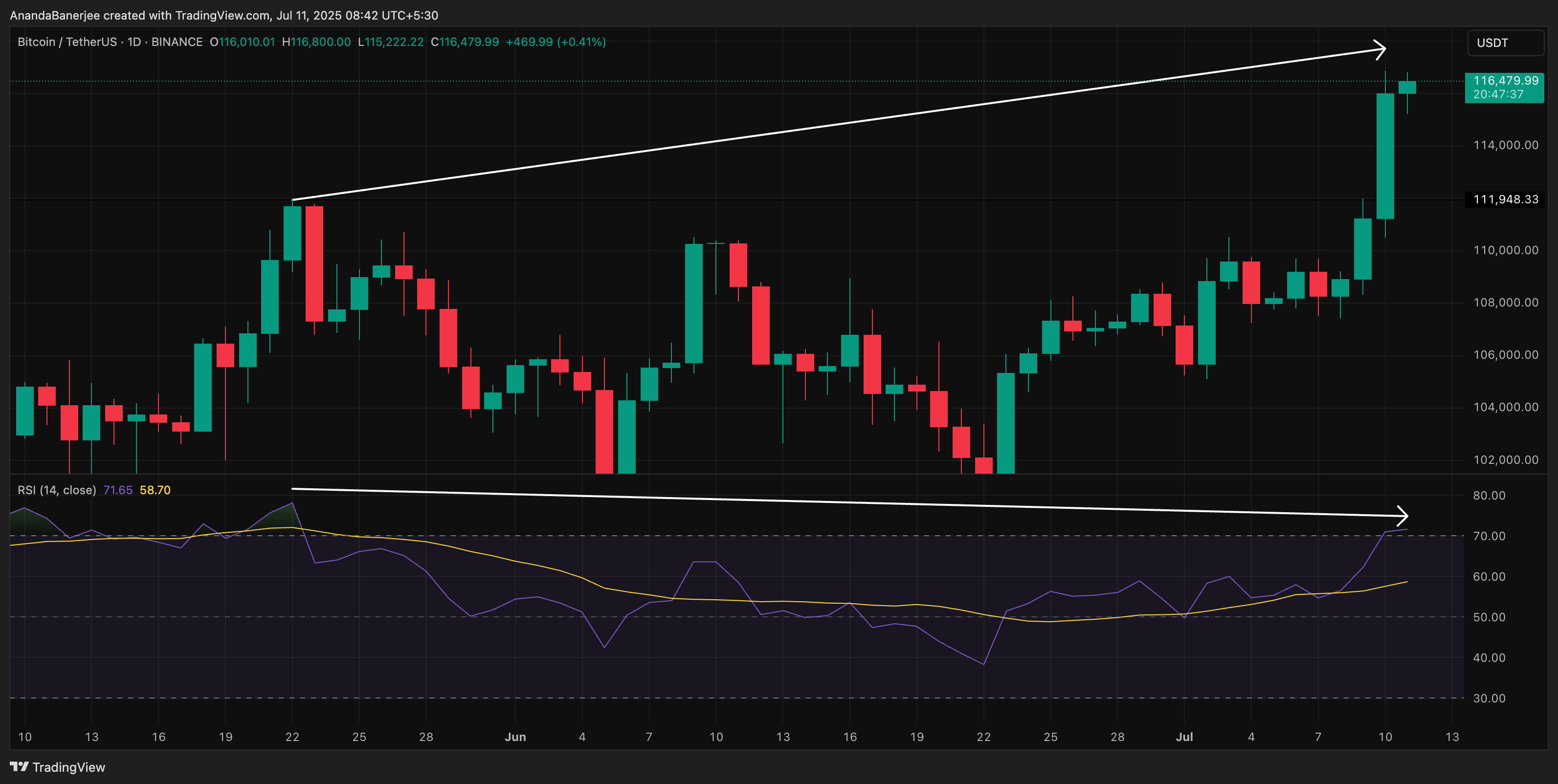 ها هي الخطر. في حين أن سعر BTC استمر في جعل أعلى مستوياته ، فإن مؤشر القوة النسبية (RSI) قد جعل أعلى مستوياته – وهو اختلاف هبوطي للكتب المدرسية. هذا يمكن أن يسبق في كثير من الأحيان تصحيح.