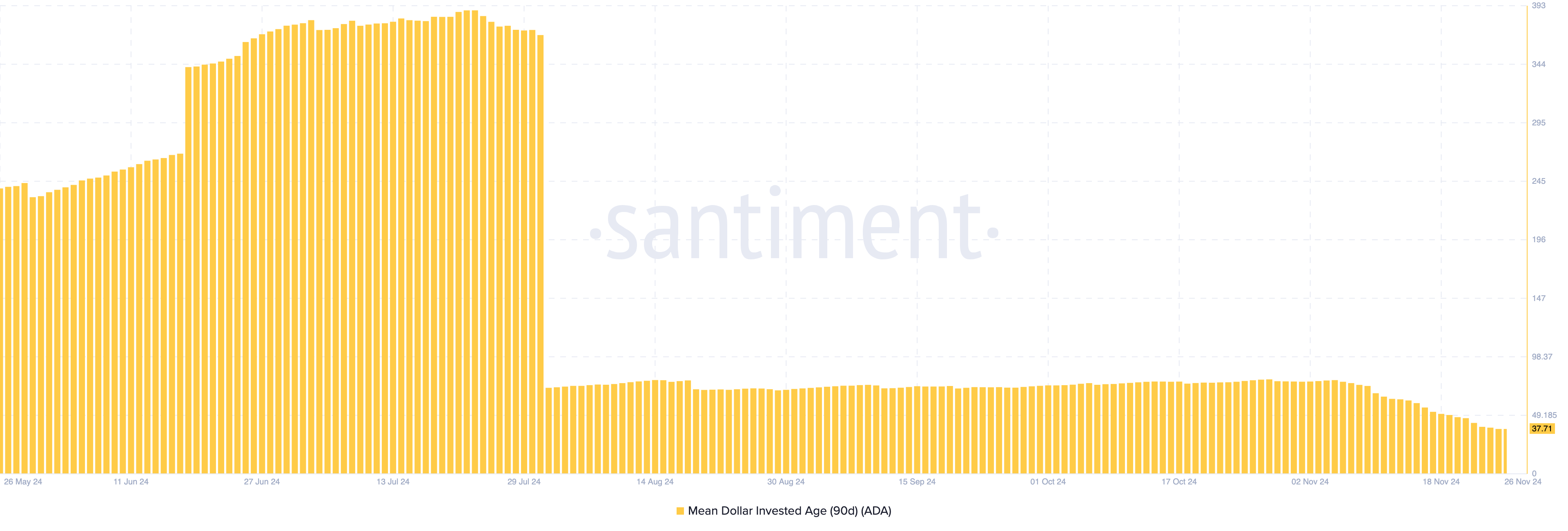 ومع ذلك، بالنسبة لكاردانو، انخفض مؤشر MDIA لمدة 90 يومًا بشكل ملحوظ، مما يشير إلى زيادة نشاط التداول للعملات الخاملة سابقًا. إذا استمر هذا الأمر، فقد يجد ADA أنه من السهل نسبيًا التداول بسعر أعلى طالما زاد ضغط الشراء.