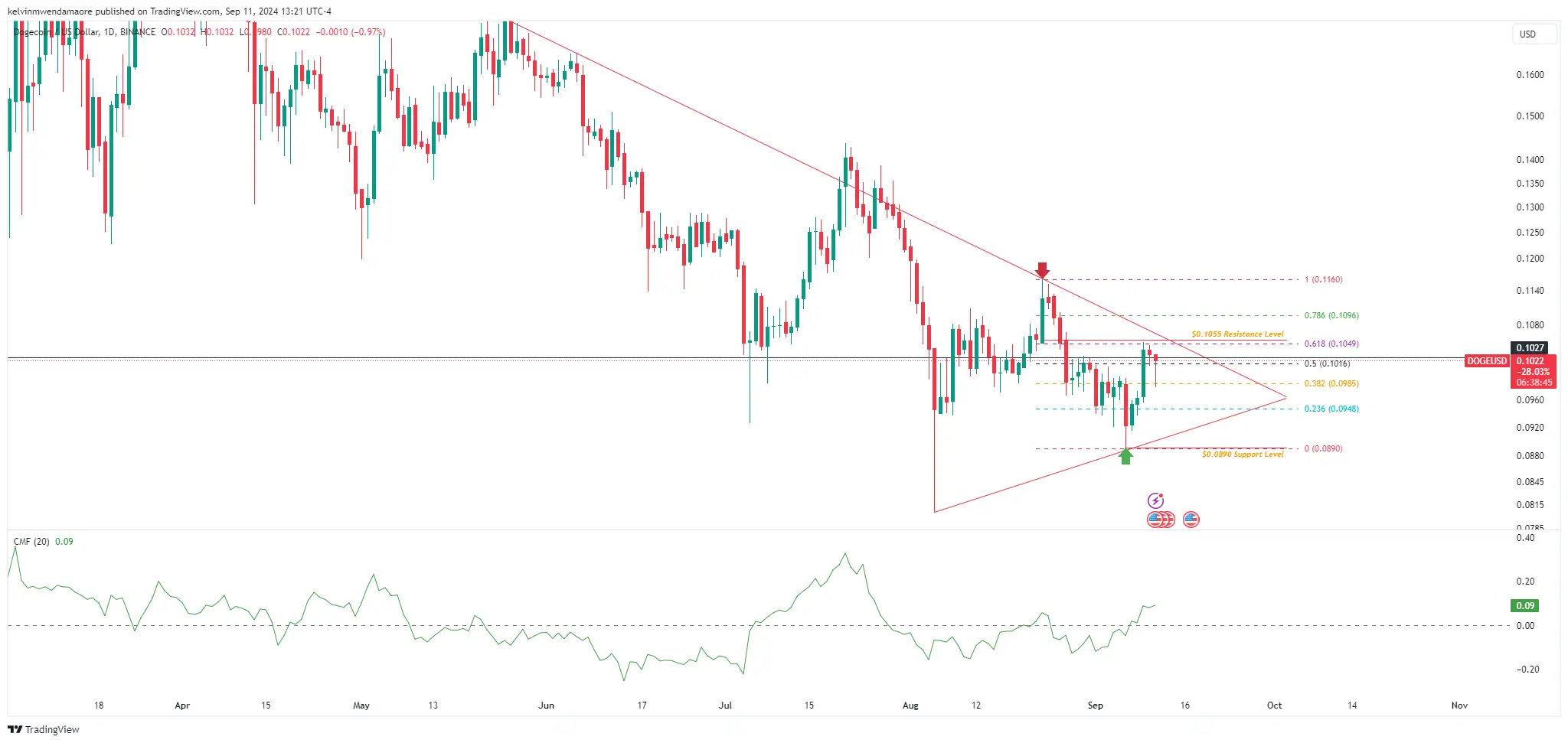 كما ينبئ النمط بإمكانية حدوث اختراق، سواء للأعلى أو للأسفل، في الأمد القريب. وإذا استمر الشعور الهبوطي على المدى القصير، فمن المرجح أن يقفز المزيد من البائعين عندما يقترب السعر من أعلى مستوى سابق عند 0.0948 دولار، وهو أيضًا عند المستوى الثالث من فيبوناتشي بنسبة 23.6%.