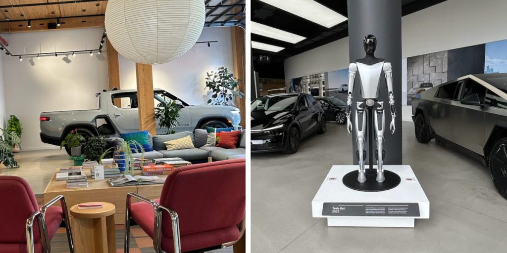 أحببت عناصر التصميم في كلتا صالات العرض. كانت Rivian's Boho Vibe مريحة ، في حين كانت تشكيلة منتجات Tesla مثيرة للإعجاب.