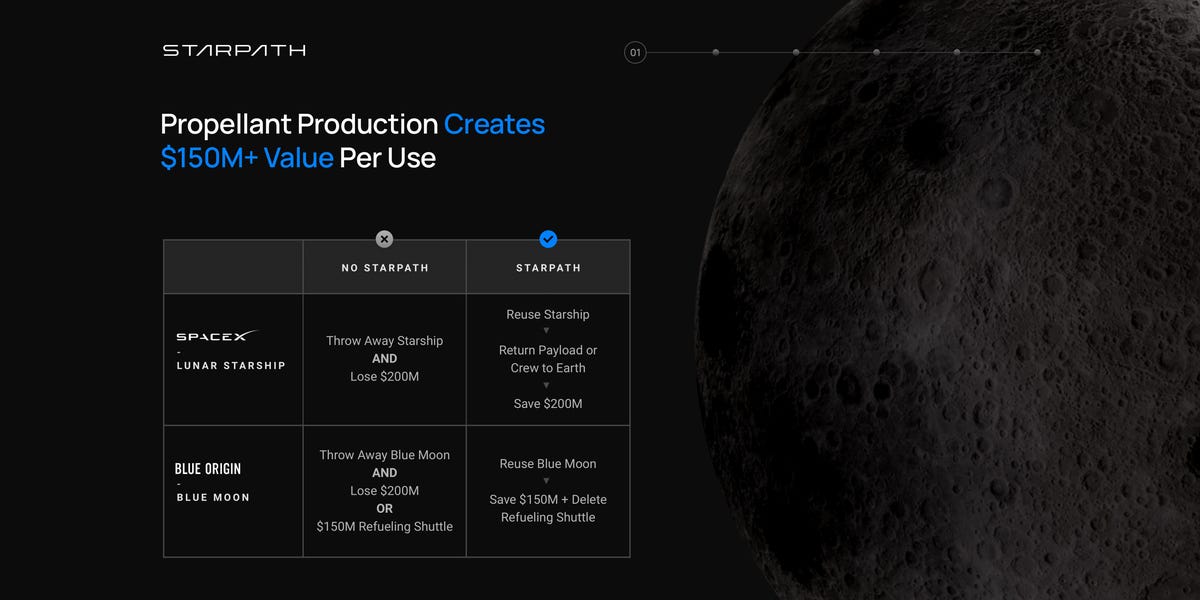 تأسست شركة ستارباث في عام 2022، وتخطط لاستخراج المياه المحتوية على الجليد من فوهات القمر للمساعدة في صنع وقود الصواريخ حتى تتمكن المركبات الفضائية من التزود بالوقود والعودة إلى الأرض.