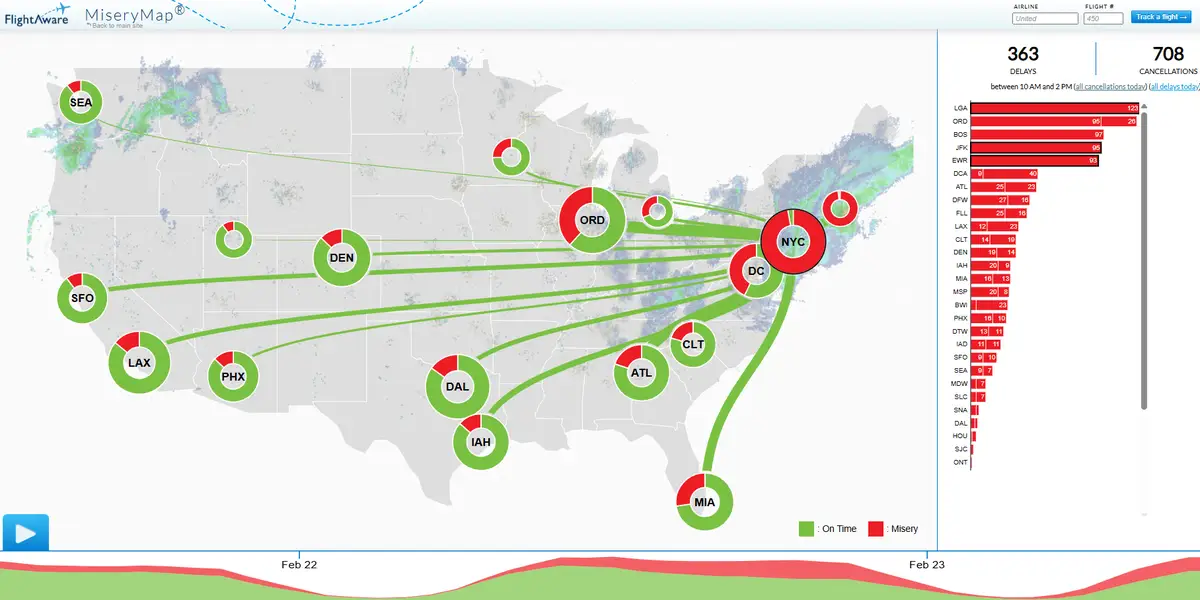 أظهرت بيانات من موقع Flightaware المتخصص في تتبع الطيران أن أكثر من 9000 رحلة جوية قد ألغيت عبر الولايات المتحدة منذ يوم الأحد، مع تركز معظم هذه الإلغاءات في المناطق الشمالية الشرقية للبلاد. وتعكس خريطة “المعاناة” التي نشرها الموقع توزع الاضطرابات، حيث شهدت المدن الرئيسية في هذه المنطقة، مثل فيلادلفيا وبوسطن، إلغاءً لما يقرب من جميع الرحلات. كما تأثرت مطارات العاصمة واشنطن بشكل كبير، مع إلغاء أكثر من نصف الرحلات المغادرة.