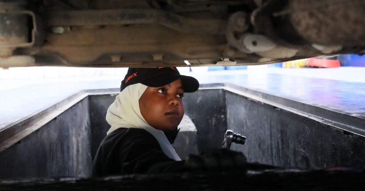 تحمل أساور مصطفى، وهي لاجئة سودانية في ليبيا، مفتاح ربط، وتفحص فلتر الزيت في القسم المخصص للنساء في أحد مراكز الصيانة في غرب ليبيا، حيث تعتبر مهنة الميكانيكا من اختصاص الرجال.