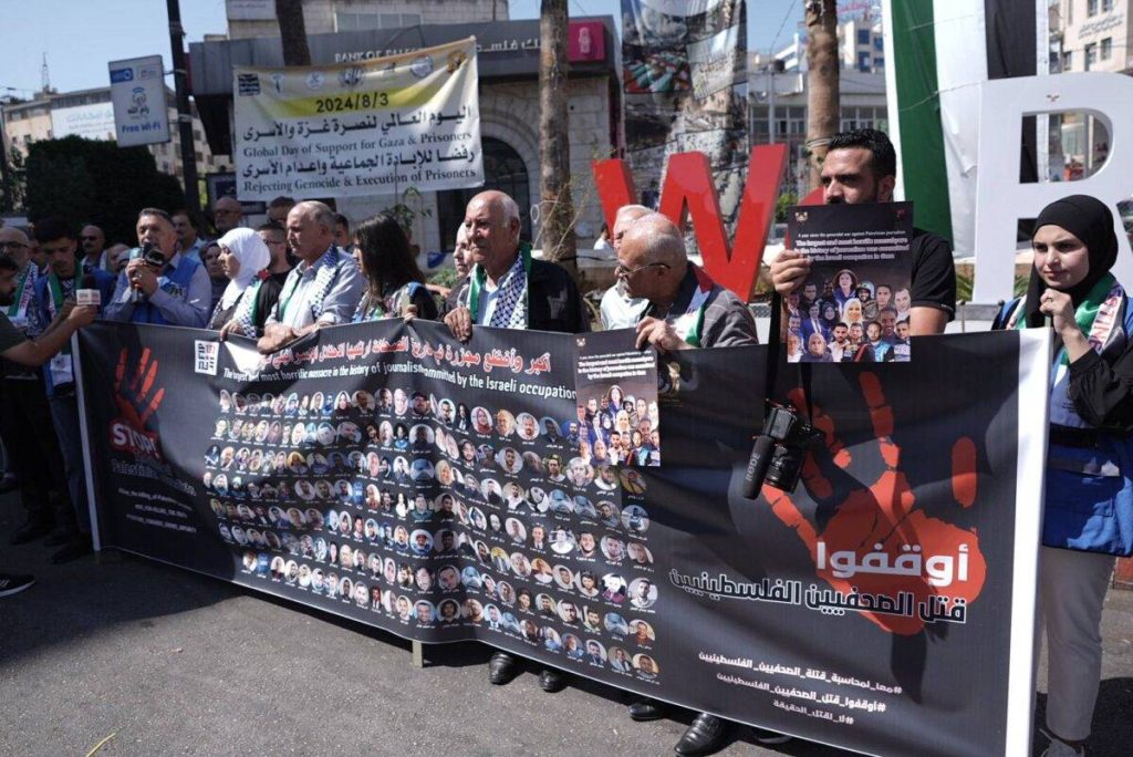 وأدان المكتب الإعلامي الرسمي في غزة استهداف إسرائيل للصحفيين الفلسطينيين؛ ويمنع الاحتلال الصحفيين الدوليين من دخول القطاع. وطالب المكتب الإعلامي المجتمع الدولي بالضغط على إسرائيل لوقف جرائم الإبادة الجماعية ووقف قتل وجرح الإعلاميين.