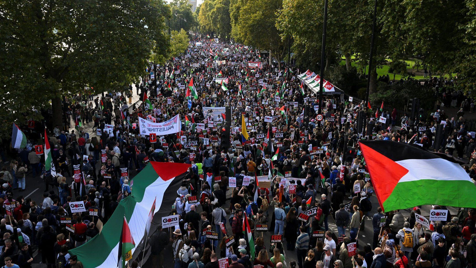 خرج مئات الآلاف من المتظاهرين المؤيدين للفلسطينيين إلى شوارع وسط لندن يوم السبت، مطالبين بالسلام الدائم في غزة، بعد يوم من دخول وقف إطلاق النار حيز التنفيذ.