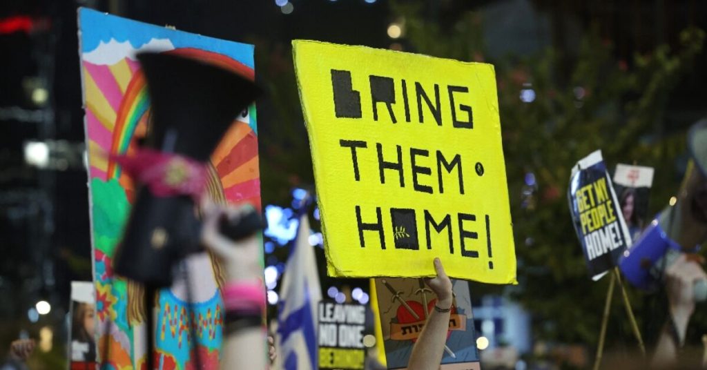وحمل المتظاهرون الذين لوحوا بالأعلام في المركز التجاري للبلاد لافتات كتب عليها شعارات من بينها “اتفاق الآن” و”أوقفوا الحرب” و”لن نتخلى عنهم”، وقرعوا الطبول وهتفوا: “لماذا ما زالوا في غزة؟”