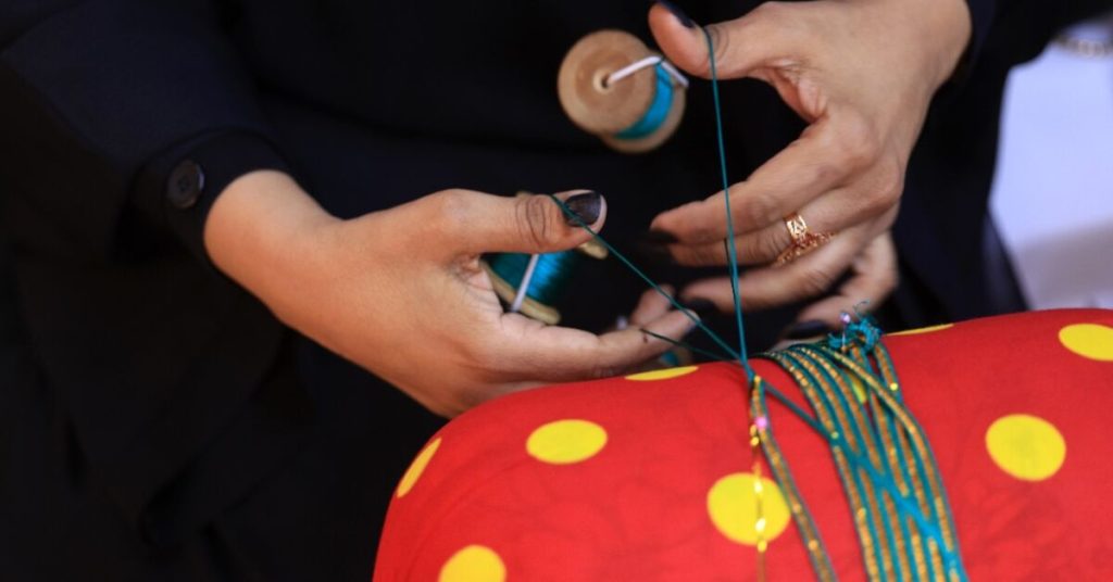 وراقبت طالبة المحاسبة، ريم الكتبي، الكلباني باهتمام وهي تعمل على وسادة مستديرة تسمى “المساندة”، حيث كانت تنسج خيطاً فضياً ذهاباً وإياباً خلال مهرجان الحرف اليدوية الأخير.