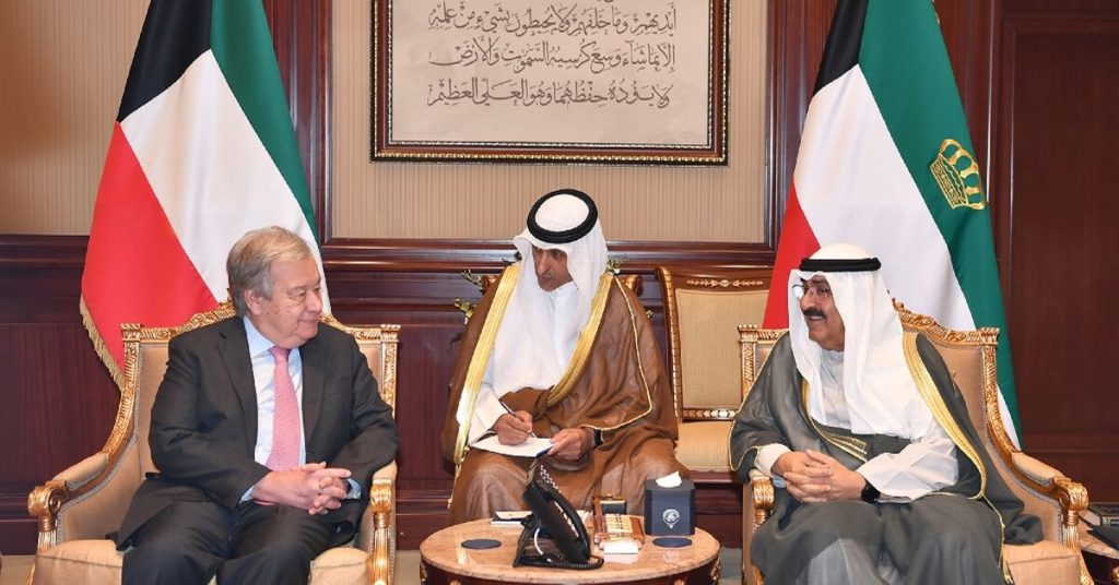 وخلال اجتماعه مع أمير الكويت الشيخ مشعل الأحمد الصباح، قبل الأمين العام للأمم المتحدة درعا فخرية “نيابة عن الأمم المتحدة، وخاصة نيابة عن ما يقرب من 200 عضو في الأمم المتحدة قتلوا في غزة”.