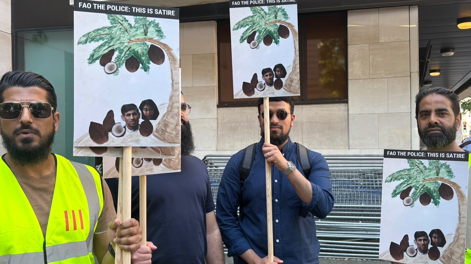 تم تصوير حسين في مظاهرة مؤيدة لفلسطين في نوفمبر/تشرين الثاني وهو يحمل لافتة تصور رئيس الوزراء البريطاني ريشي سوناك ووزيرة الداخلية آنذاك سويلا برافيرمان، وكلاهما من أصل آسيوي بريطاني، على شكل جوز الهند.