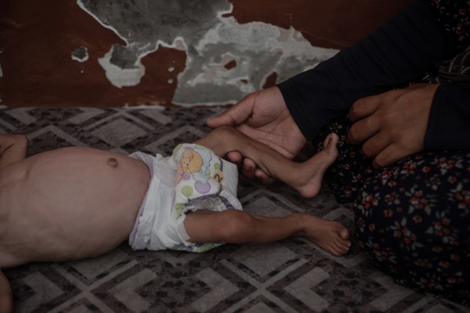 طفل فلسطيني يبلغ من العمر خمسة أشهر ، عمار محمد عمارة ، يعاني من ارتفاع مستمر وسوء التغذية الشديد منذ الولادة بسبب هجمات إسرائيل المستمرة والحصار في مدينة غزة ، غزة في 6 أغسطس 2025.