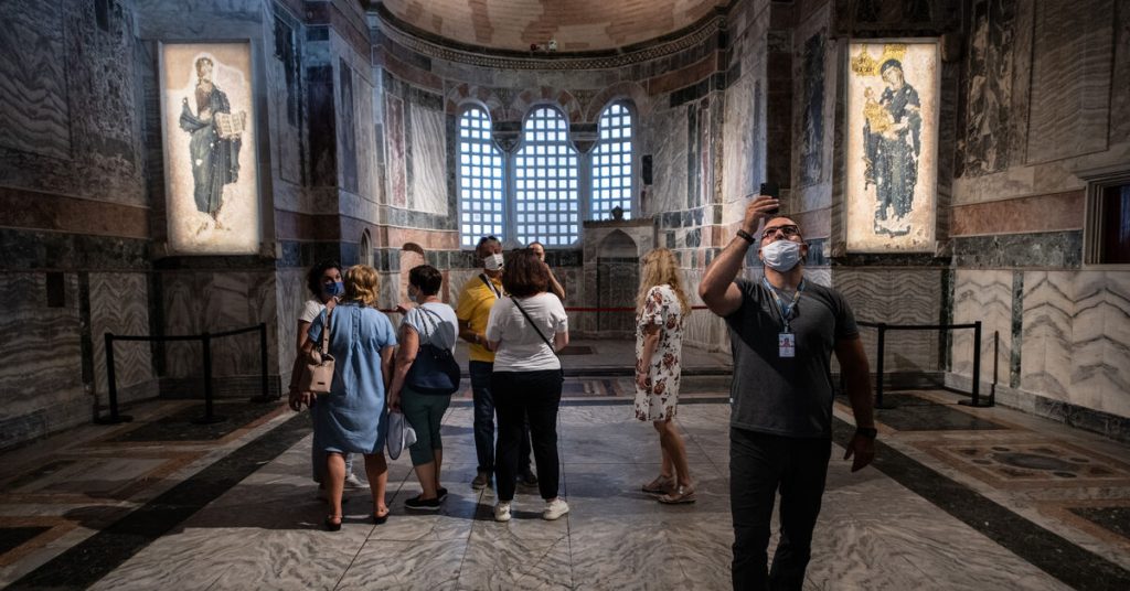 محمية من الصور المحظورة ليسوع ومريم العذراء بواسطة لوحات مصممة خصيصًا، ارتفعت صفوف المؤمنين صعودًا وهبوطًا وهم يهتفون “الله أكبر” أو “الله أكبر” خلال الصلاة الافتتاحية في تشورا، وهي كنيسة بيزنطية أسطورية في إسطنبول. يوم الاثنين، مما عزز إعادة وضعه كمسجد متكامل الخدمات، وهو الأحدث في موجة من مثل هذه التحولات التي تعكر صفو العلاقات مع اليونان.