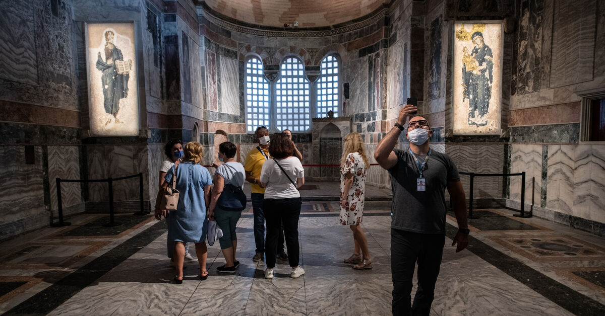 وشارك الرئيس رجب طيب أردوغان، الذي دافع عن التحولات، في حفل الافتتاح، وإن كان بشكل افتراضي، والذي تم بثه على التلفزيون الوطني. تم ذلك بعد أربع سنوات من الإصلاحات داخل الكنيسة وخارجها. وقال الزعيم الأطول حكما في البلاد والإمام المدرب: “ليكن ميمونا”، بينما كان الزائرون المعممون يرتدون السراويل الفضفاضة يتجولون حول أجزاء من الصرح الصغير الذي يعود تاريخه إلى القرن السادس، حيث لا تزال فسيفساءه ولوحاته الجدارية المذهلة مكشوفة.