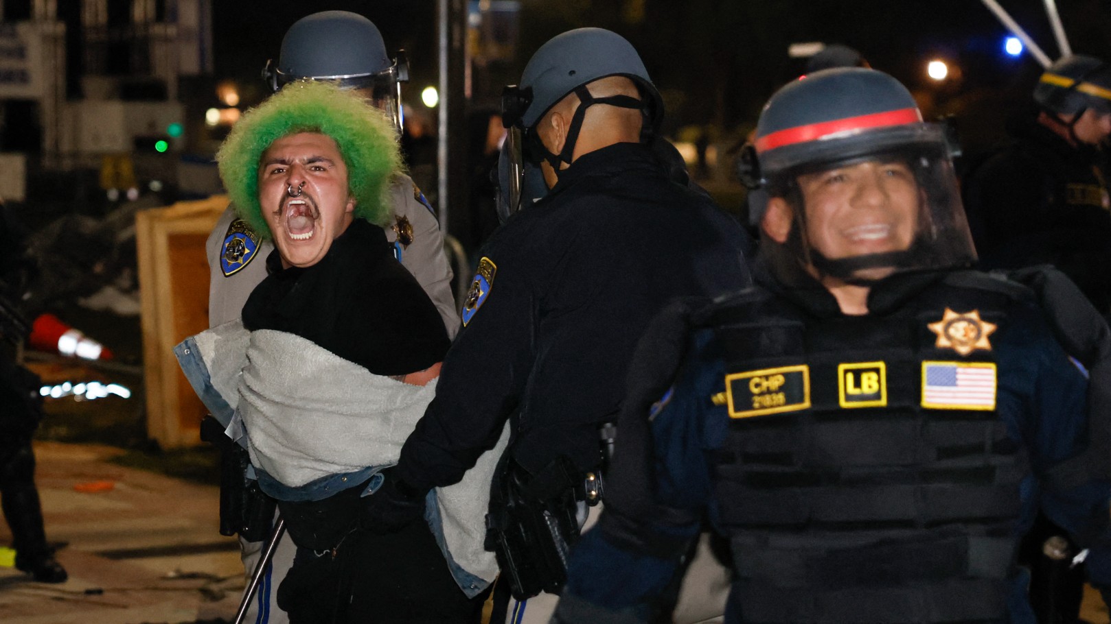 وشوهد العشرات من الطلاب المتظاهرين وهم راكعون على الأرض وأذرعهم مقيدة خلف ظهورهم بينما اعتقلهم الضباط واستمروا في جلب المزيد من المتظاهرين خارج المعسكر.