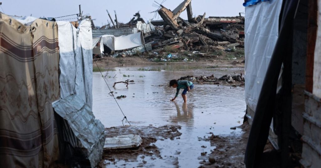 تظهر مشاهد من داخل مخيمات النزوح في غزة حجم المعاناة التي يعيشها السكان. في مخيم النصيرات بوسط القطاع، استخدم الفلسطينيون الأوعية والدلاء والمجارف لإزالة المياه المتجمعة حول خيامهم المصنوعة من الأغطية البلاستيكية. الأطفال، بعضهم حفاة القدمين والبعض الآخر يرتدون صندلاً مفتوحاً، يكافحون للمرور عبر برك المياه الموحلة بينما تستمر الأمطار في الهطول.