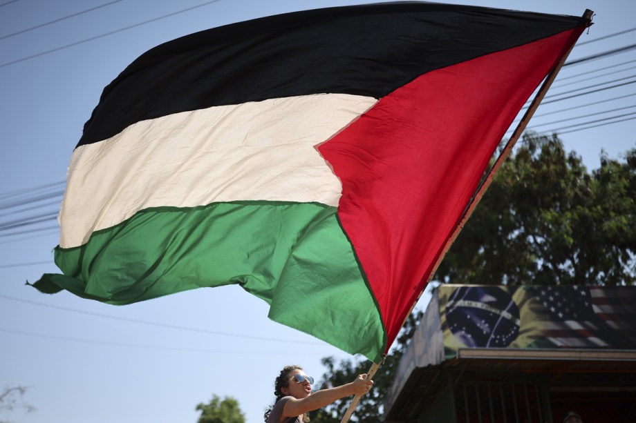 احتجاج أمام السفارة الأمريكية بمناسبة مرور عامين على هجوم 7 أكتوبر 2023 على غزة، في برازيليا بالبرازيل في 7 أكتوبر 2025. (ماتيوس بونومي – وكالة الأناضول)