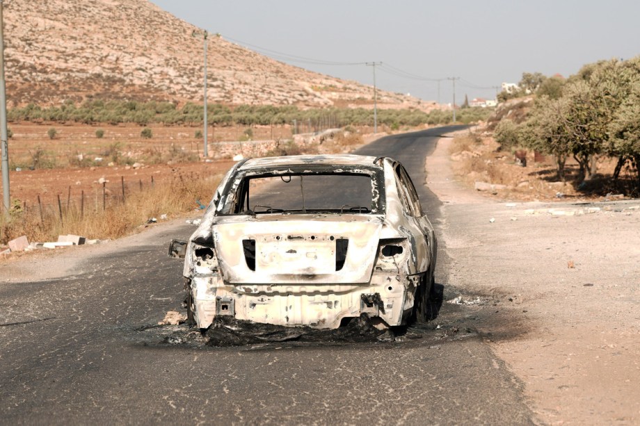 منظر للأضرار بعد أن أشعل مستوطنون يهود النار في أراضي ومركبات مملوكة لفلسطينيين في الجزء الشمالي من رام الله بالضفة الغربية، 16 أغسطس، 2025. (عصام الريماوي – وكالة الأناضول)