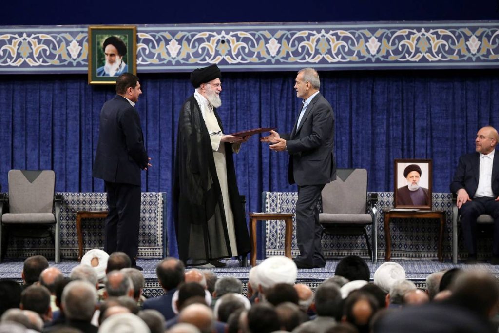 وفي حفل أقيم في طهران حضره كبار القادة السياسيين والعسكريين بالإضافة إلى دبلوماسيين أجانب، سلم المرشد الأعلى المرسوم الموقع إلى بزشكيان.