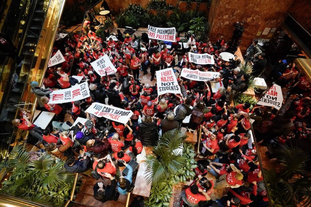 يهتف “محمود حر ، حررهم جميعًا!” “نريد العدالة ، هل تقول كيف؟ أحضر محمود إلى المنزل الآن! ” و “قتال النازيين ، وليس الطلاب!” ملأ المتظاهرون مع المجموعة اليهودية من أجل السلام ردهة برج ترامب ، معربًا عن معارضتهم لاعتقال الناشط.