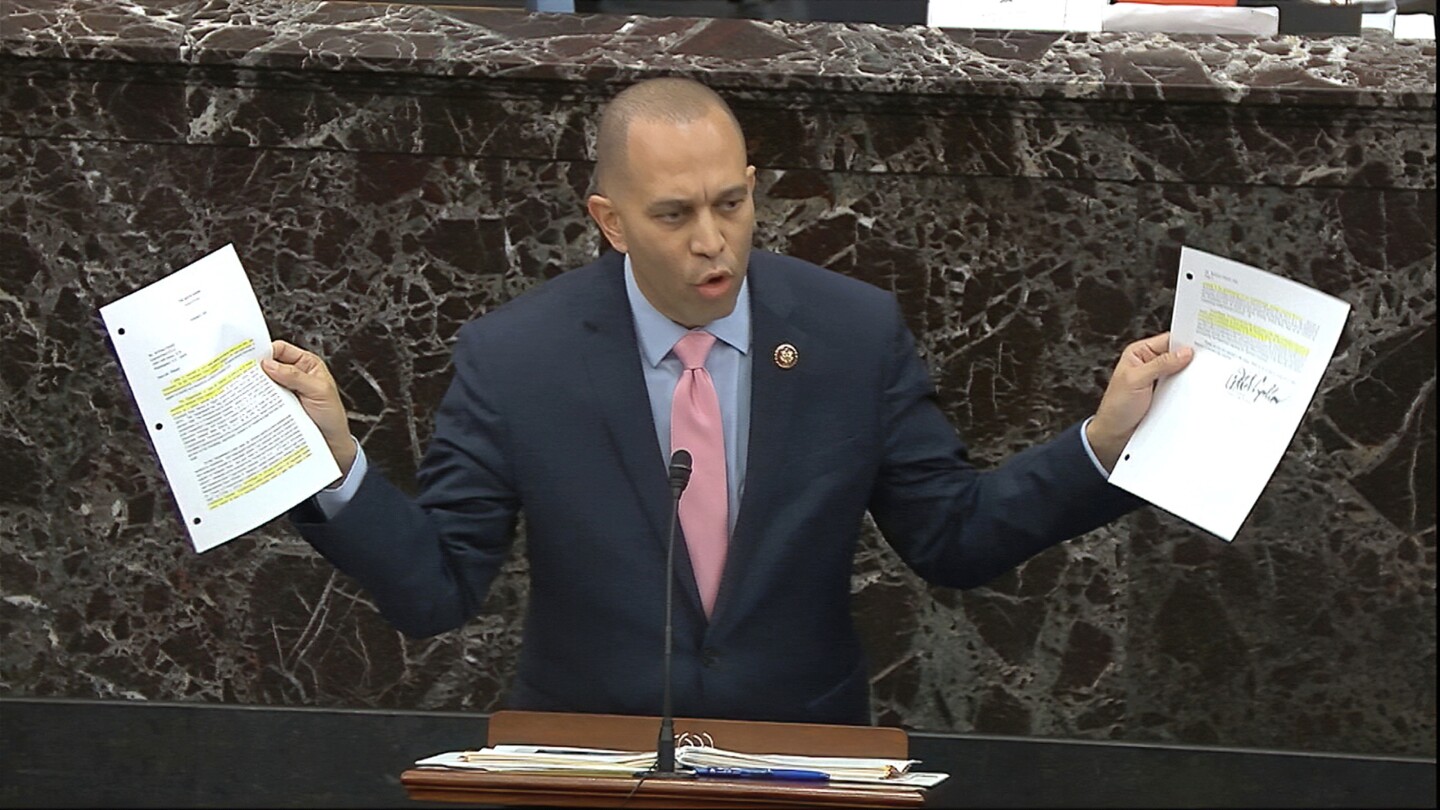 ملف – النائب حكيم جيفريز، DN.Y.، يتحدث خلال احتفال اللجنة القضائية بمجلس النواب بقانون العدالة في الشرطة لعام 2020 في الكابيتول هيل في واشنطن، 17 يونيو، 2020. (Greg Nash/Pool via AP, File)