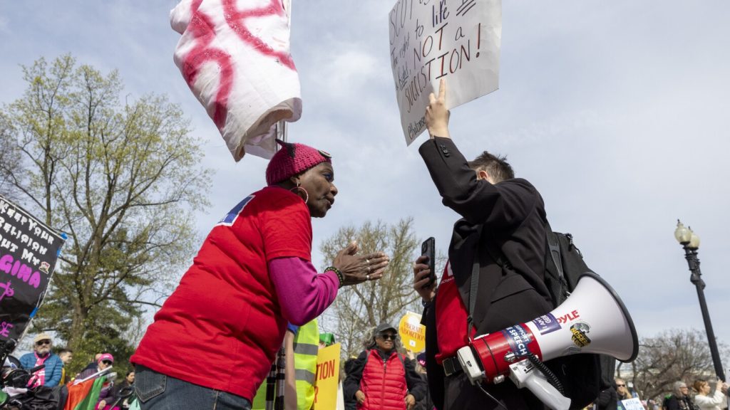 نشطاء حقوق الإجهاض يتجمعون خارج المحكمة العليا، الثلاثاء 26 مارس 2024، في واشنطن. (صورة AP / خوسيه لويس ماجانا)