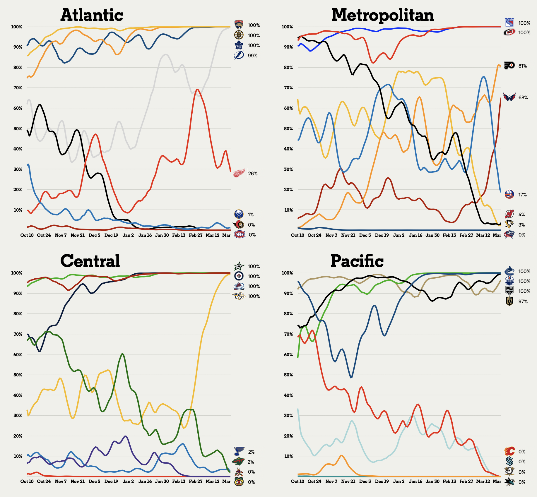 مرحبًا بك في صفحة توقعات واحتمالات دوري الهوكي الوطني (NHL) حيث ستجد إجمالي النقاط المتوقعة لكل فريق، واحتمالية إجراء التصفيات واحتمالات التقدم إلى كل جولة لاحقة، بما في ذلك الفوز بكأس ستانلي.