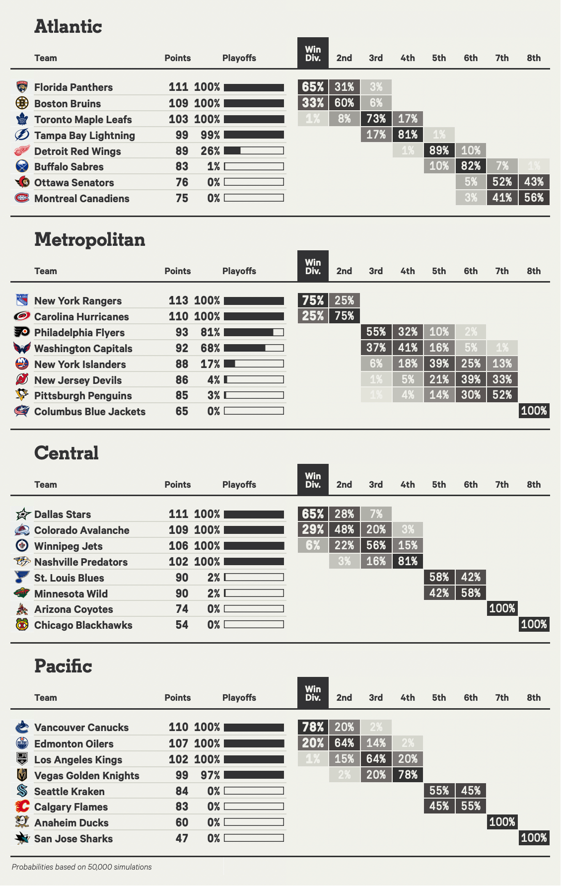 مرحبًا بك في صفحة توقعات واحتمالات دوري الهوكي الوطني (NHL) حيث ستجد إجمالي النقاط المتوقعة لكل فريق، واحتمالية إجراء التصفيات واحتمالات التقدم إلى كل جولة لاحقة، بما في ذلك الفوز بكأس ستانلي.