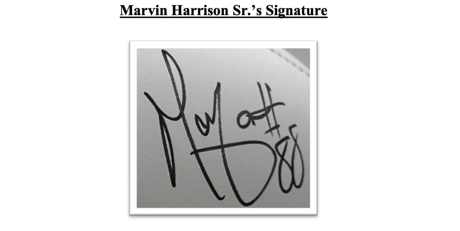 في يوليو/تموز، وقع هاريسون جونيور على إقرار خطي يعترف فيه بأن شركة Marvin Harrison Collection Company الرسمية قد وقعت اتفاقية مع Fanatics – لكن هاريسون جونيور نفسه لم يوقع على أي شيء على الإطلاق. وقال في الإقرار الخطي إن الممثل هو والده.