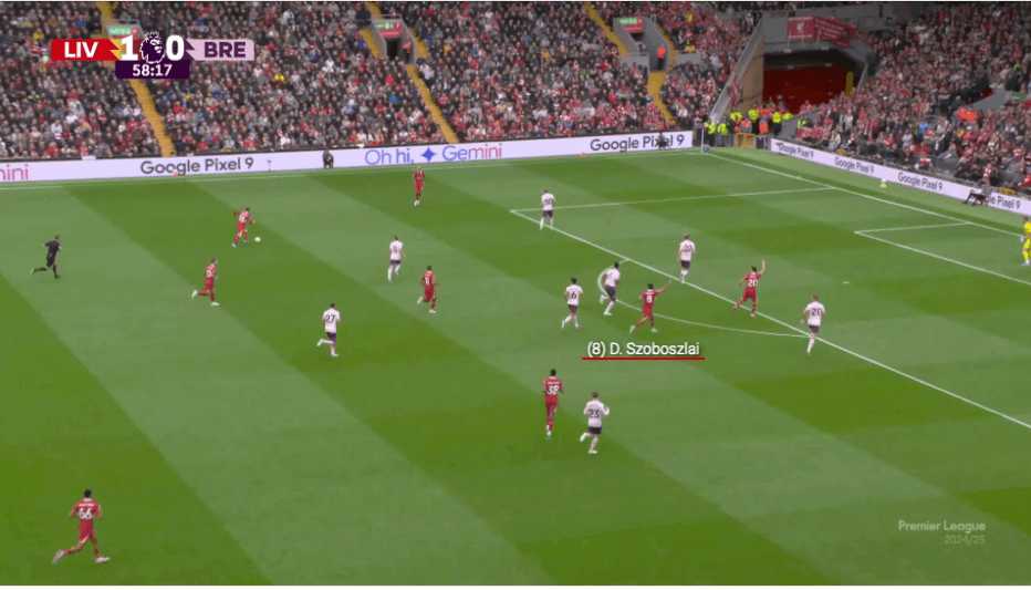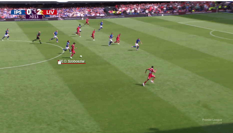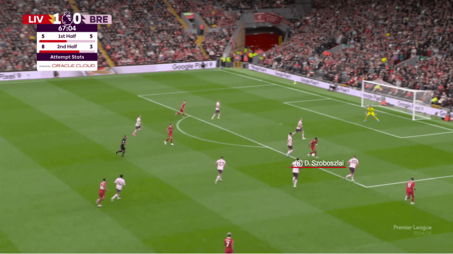 وفي المباراة نفسها، كان من الممكن رؤية زوبوسزلاي وهو يركض نحو منطقة الجزاء باعتباره أحد المهاجمين الأكثر تقدماً، ويفعل بالضبط ما يريده سلوت من خلال ملء منطقة الجزاء باللاعبين المهاجمين.
