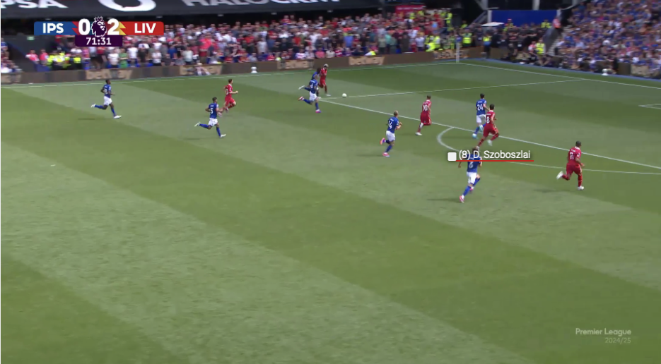 وحدث نفس الشيء في الشوط الثاني ضد إيبسويتش. ويبدو هذا بمثابة “ليفربول جديد” مع وجود لاعبي خط الهجوم بشكل متماسك نسبيًا، على الرغم من أن ألكسندر أرنولد عرض عرضيًا لتمديد الخط الخلفي وفتح المساحة في المنتصف.