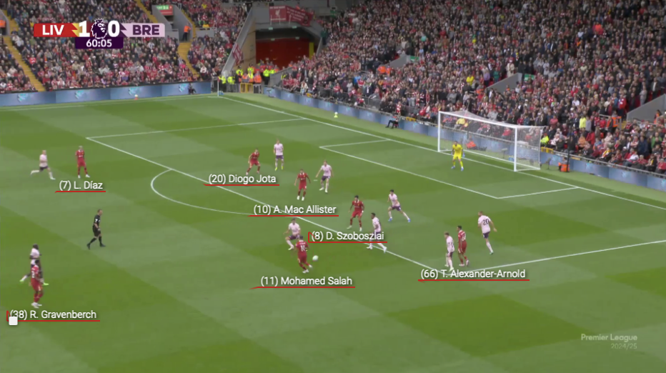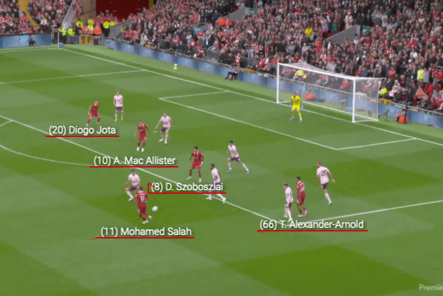 وبفضل الأقدام السريعة لدومينيك زوبوسزلاي وأليكسيس ماك أليستر، اللذين يعتمد عليهما صلاح في المراكز الهجومية، استخدم صلاح اللاعبين الثلاثة في تمرير الكرة – الصورة أدناه توضح خياراته – وكاد أن يضع اللمسة الأخيرة على ما كان ليصبح أحد أعظم أهداف أنفيلد على الإطلاق، ومنافسًا مبكرًا على جائزة هدف الموسم.