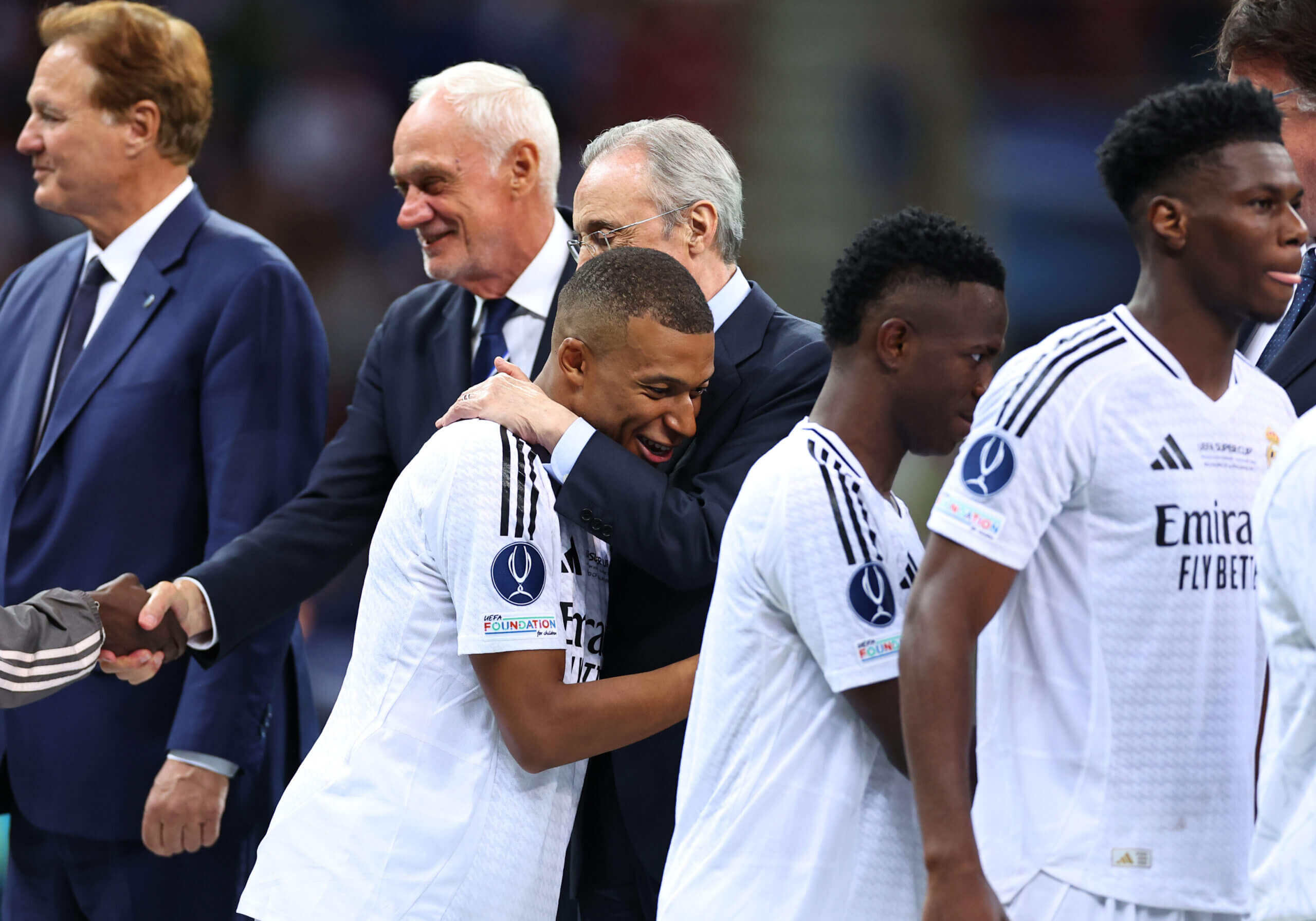 بيريز ومبابي يحتضنان بعضهما بعد المباراة (روبي جاي بارات – AMA/Getty Images)