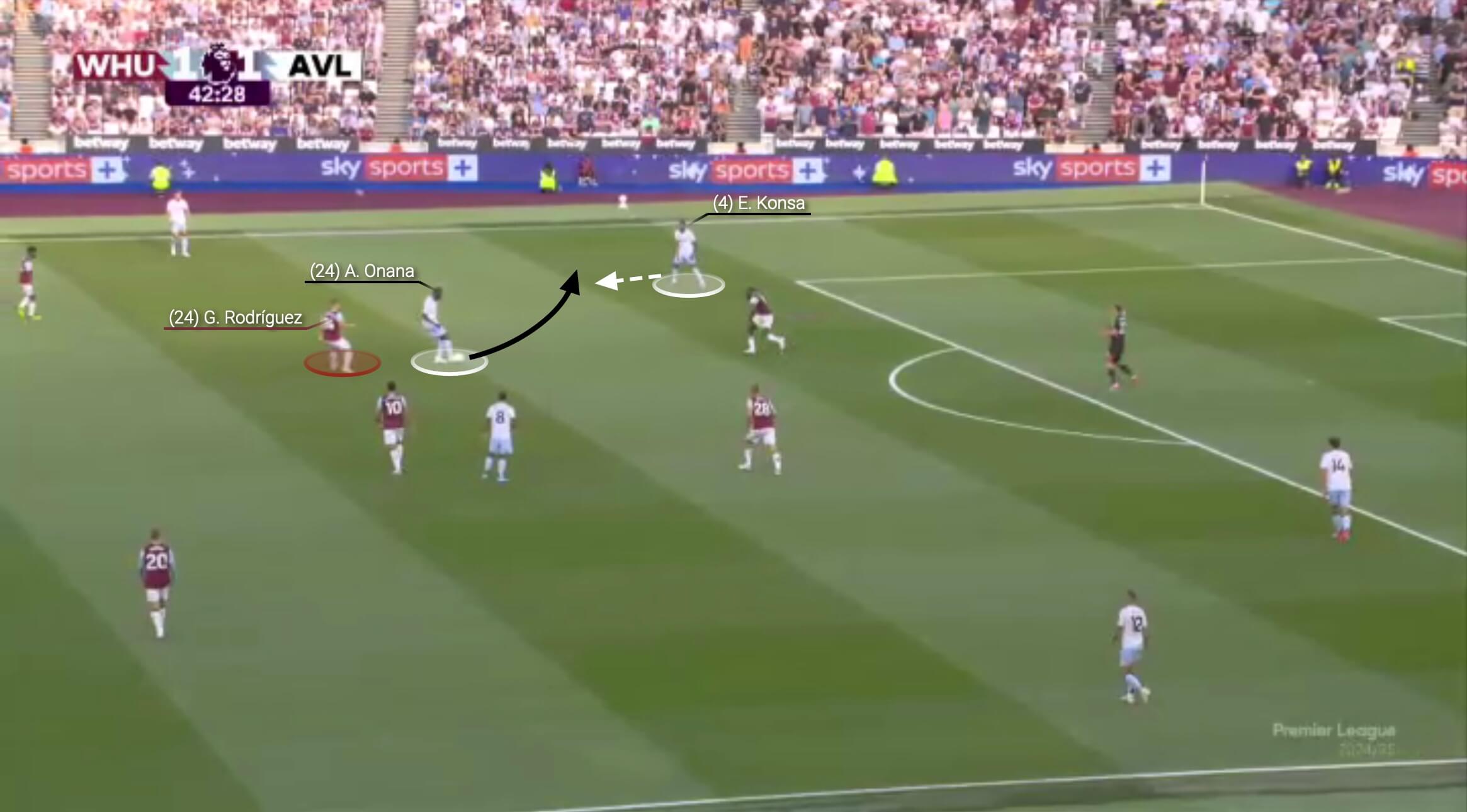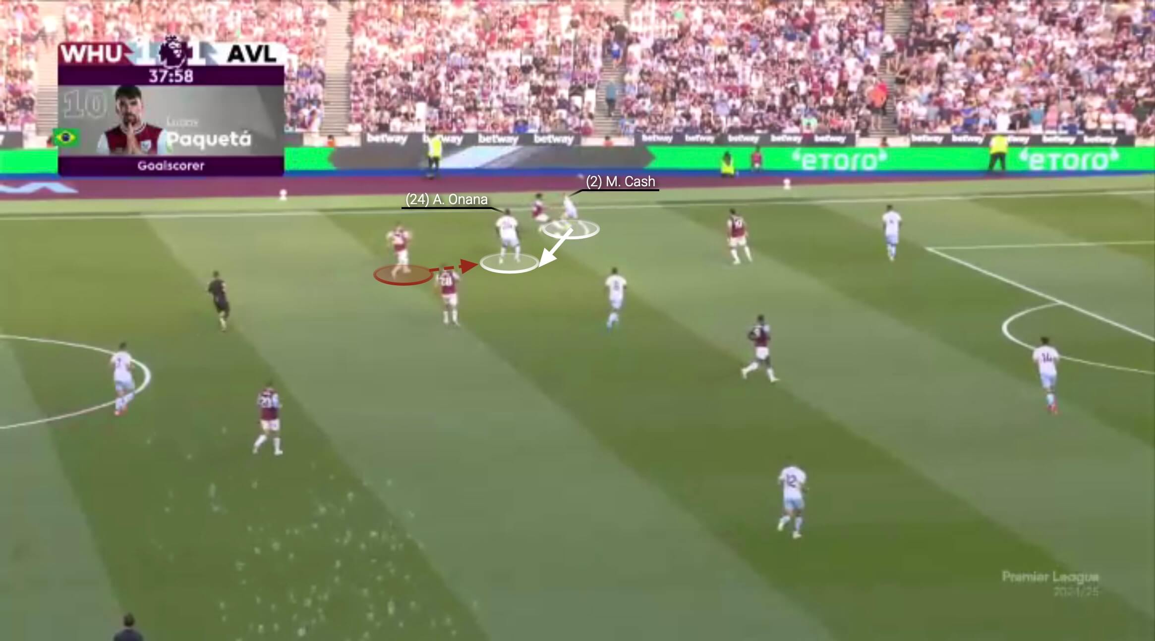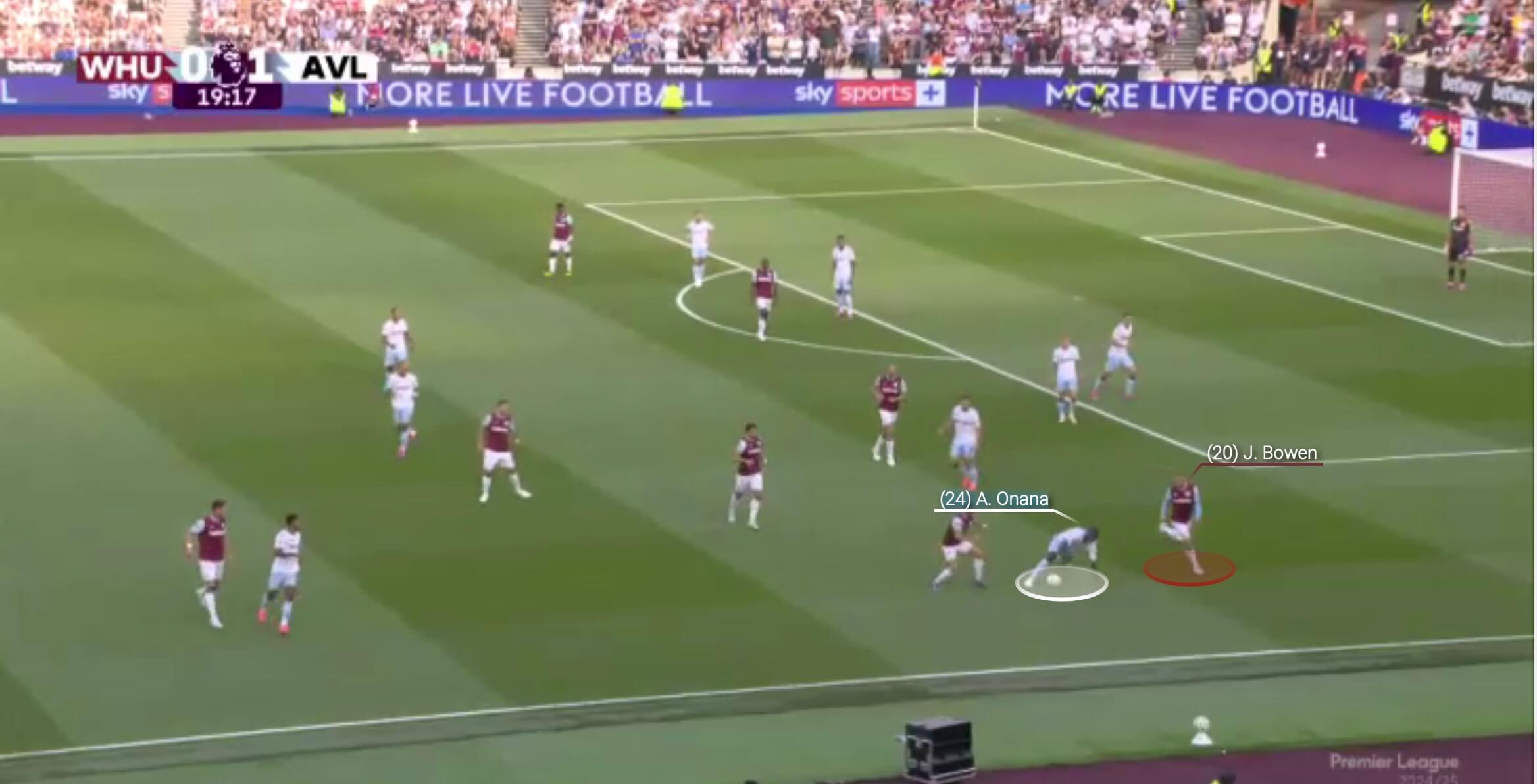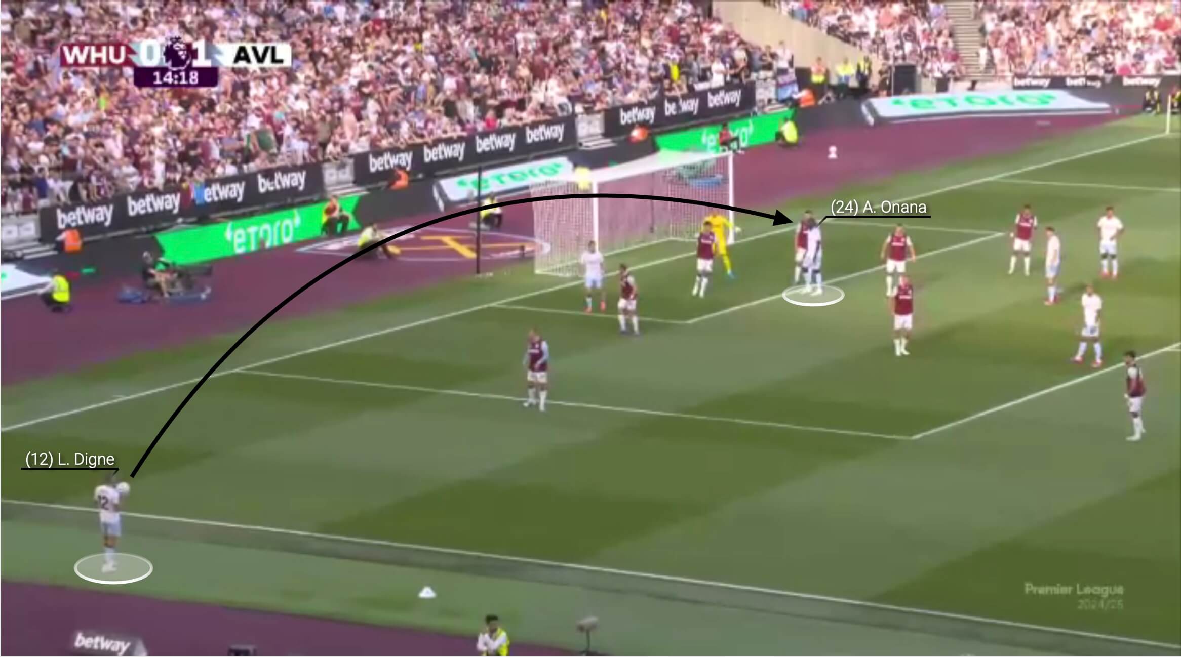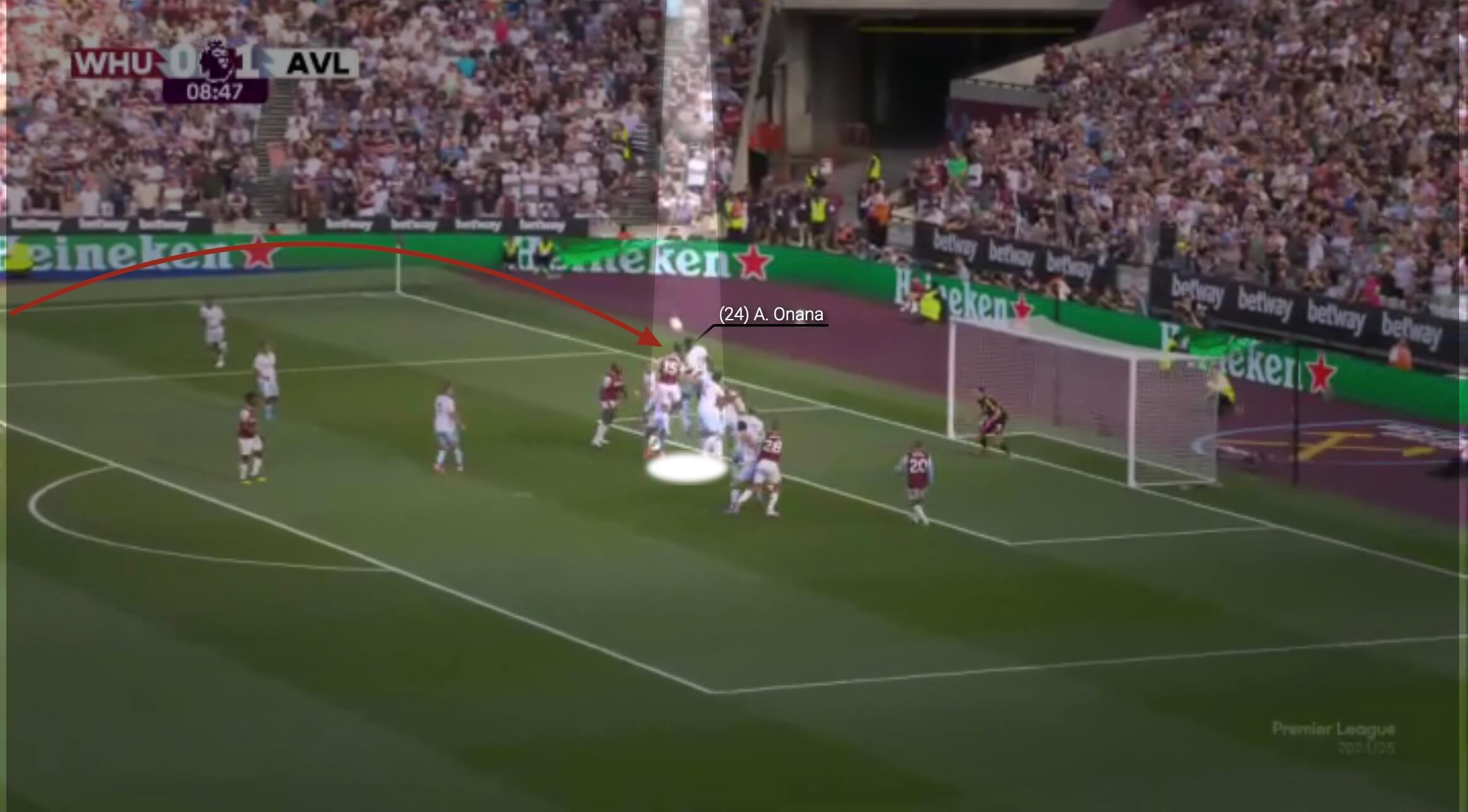 ومن اللافت للنظر أن رميات فيلا الثلاث الأولى في الثلث الأخير من الملعب كانت موجهة نحو أونانا، الذي اتخذ موقعا داخل منطقة جزاء وست هام.