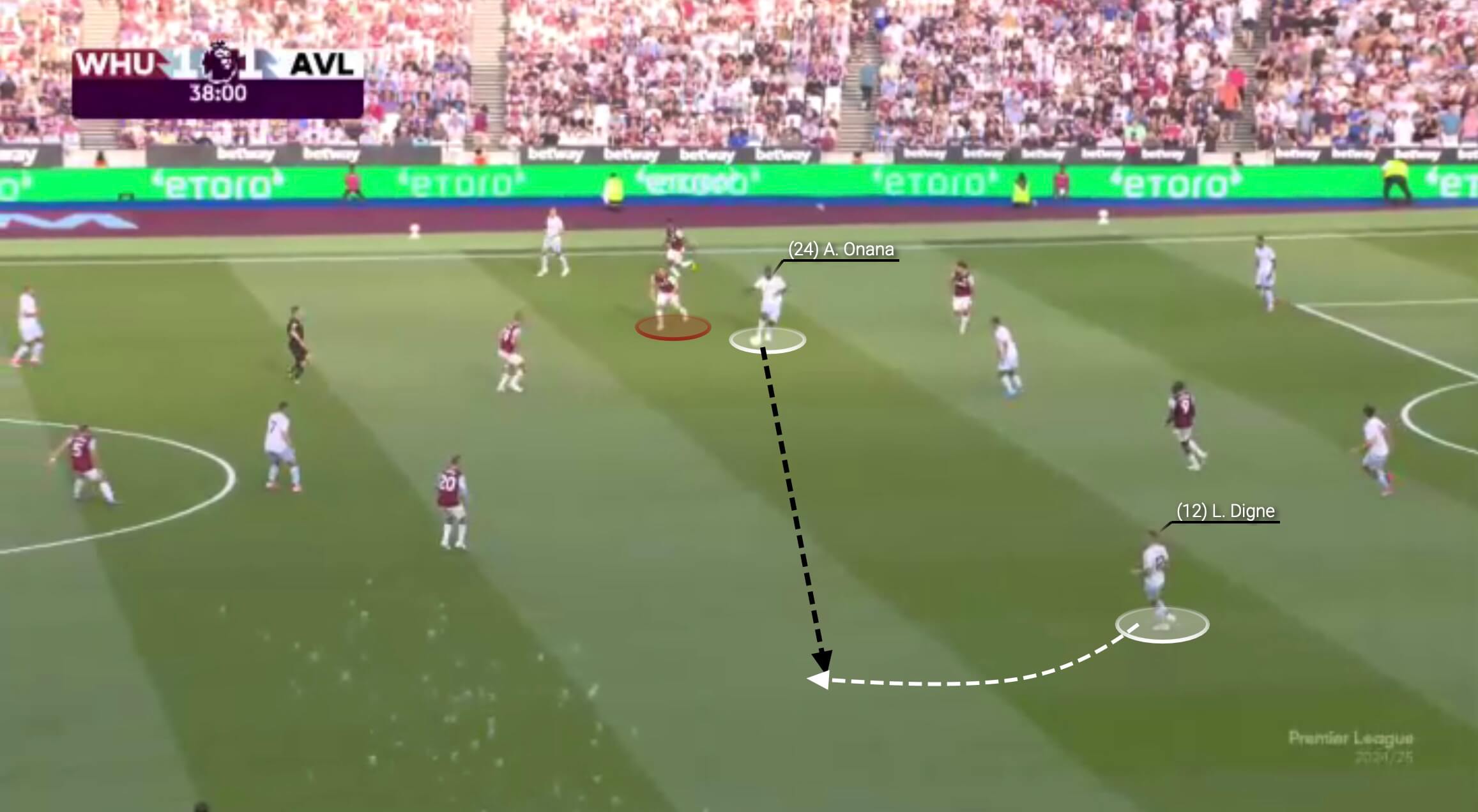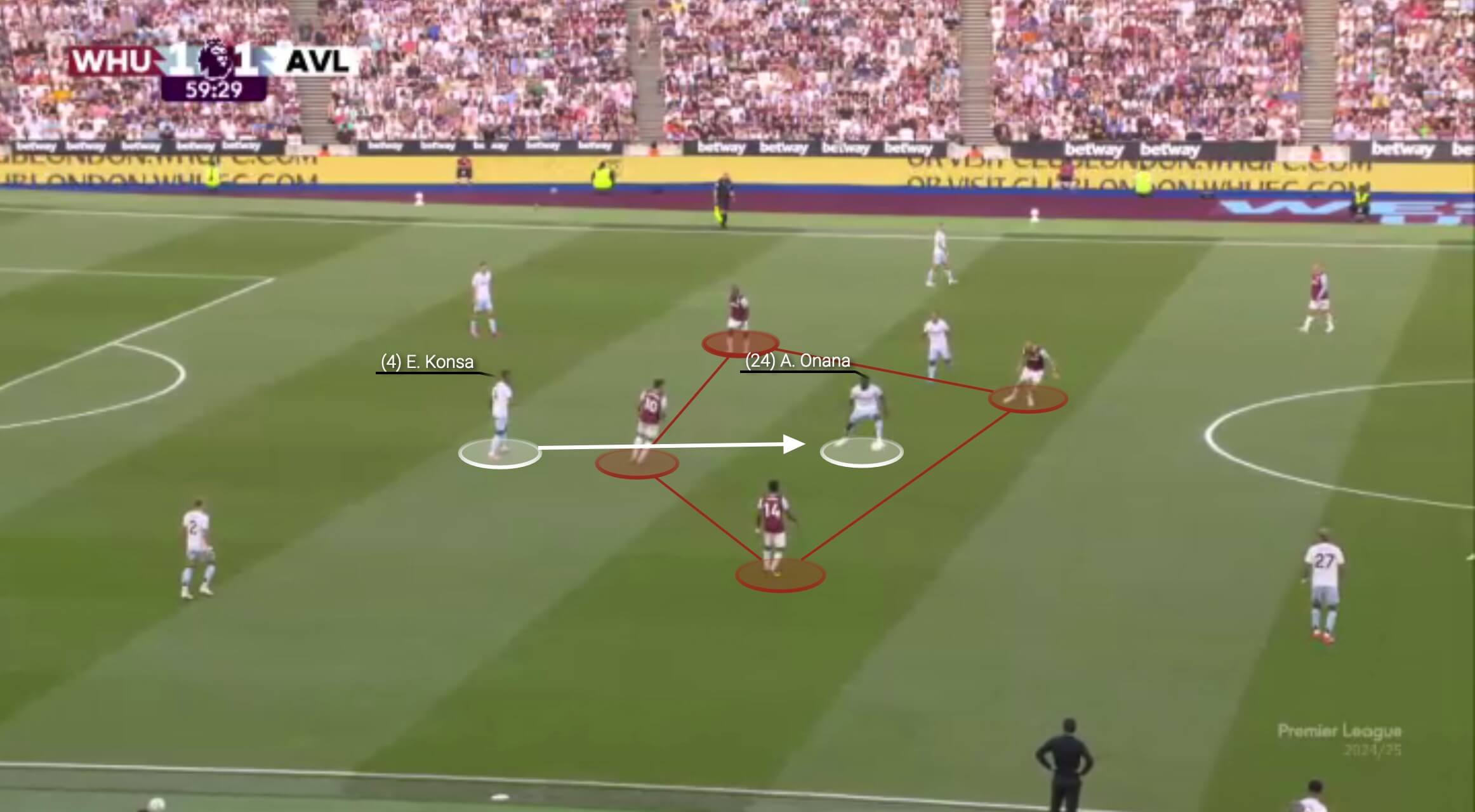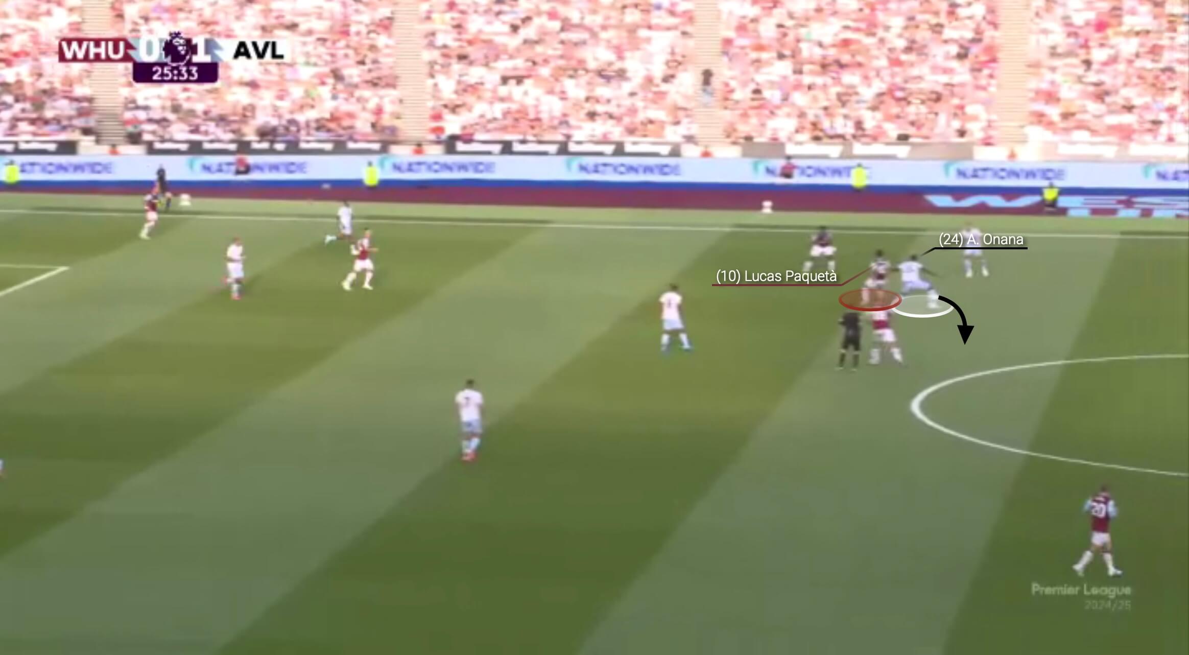 واصل أونانا اللعب بسرعة وحسم، وكان دائمًا على دراية بالتمريرات التالية التي يتلقاها، مما جعل من الصعب على وست هام الضغط بشكل جماعي، وغالبًا ما كان يتركهم على بعد ياردة واحدة من اعتراض الكرة أو ممارسة الضغط الفعال.