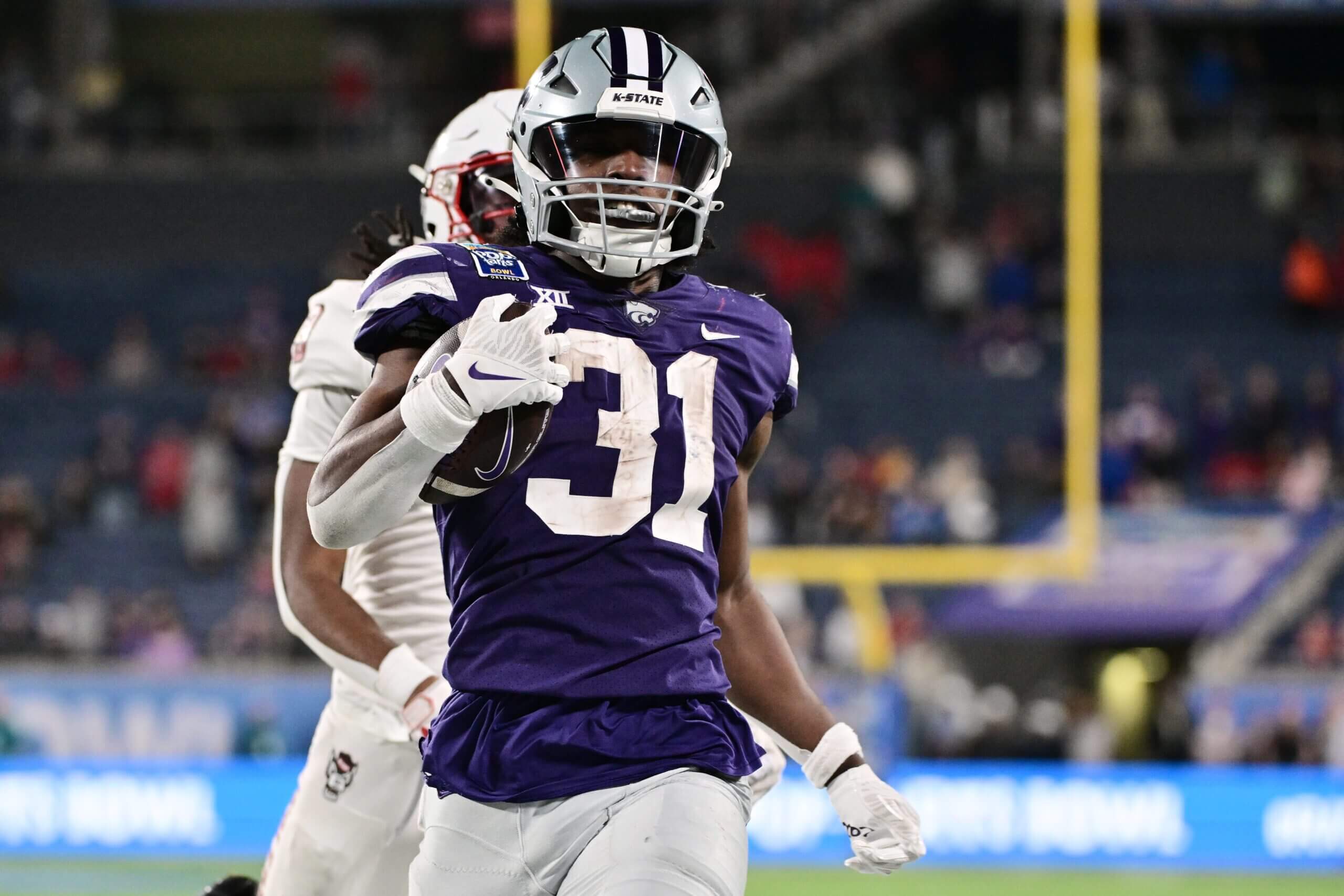 سجل دي جي جيدنز 151 ياردة وسجل هدفًا في فوز ولاية كانساس على ولاية كارولينا الشمالية في مباراة Pop-Tarts Bowl. كما استقبل تمريرة هدفًا. (خوليو أغيلار / جيتي إيماجيز)