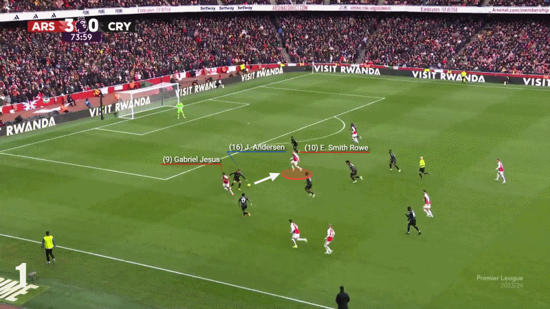 كما نرى في فوز الفريق على كريستال بالاس 5-0 في يناير، يتعاون جابرييل جيسوس وسميث رو في مواجهة ثنائية ضد يواكيم أندرسن. يستقبل سميث رو الكرة، ويفتح فخذيه، ويمرر تمريرة مثالية إلى جيسوس. لكن كريس ريتشاردز اعترض تمريرة جيسوس وأبعدها.