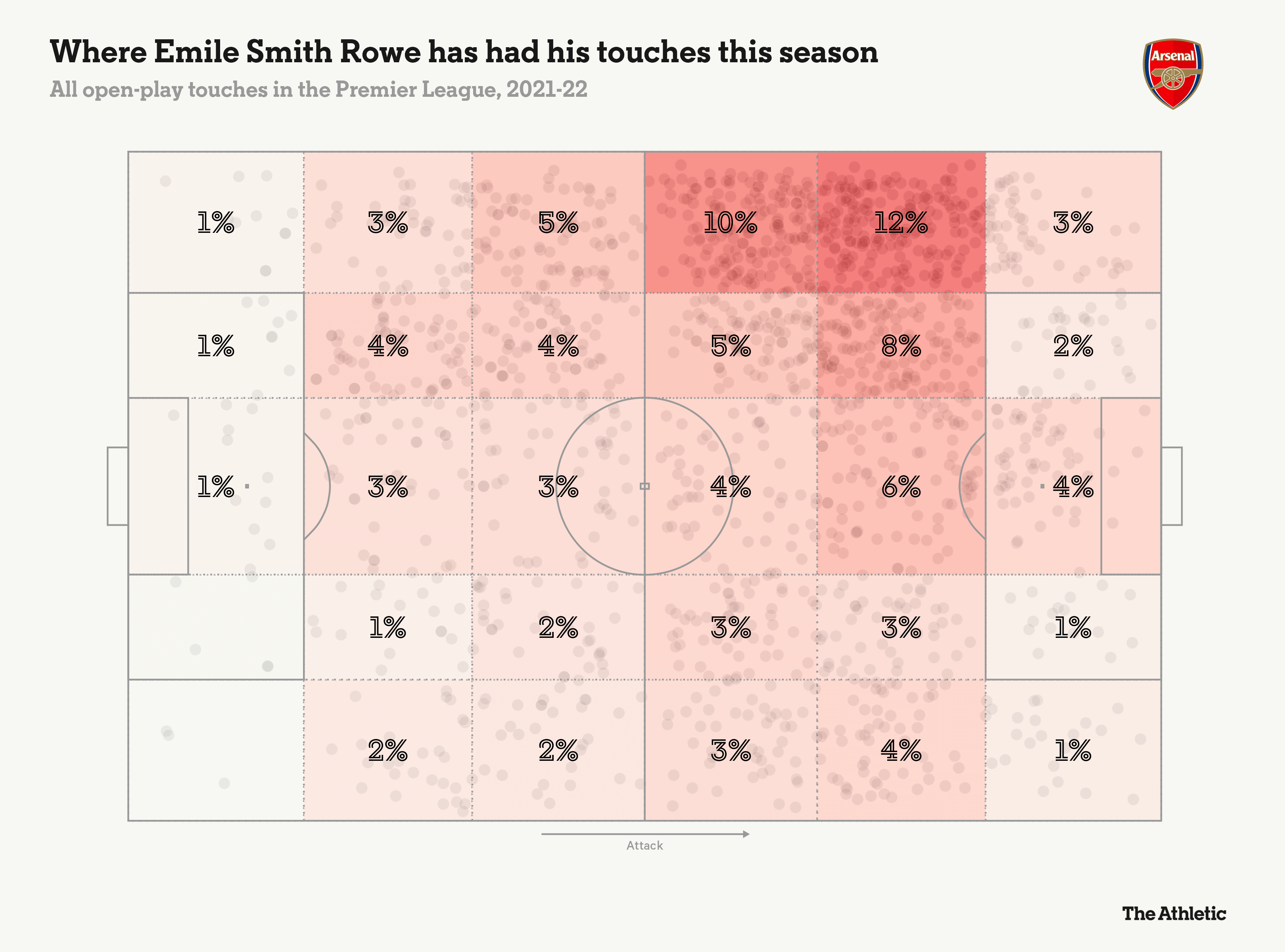 من خلال هذا التصور، يمكننا أن نرى أن سميث رو يعمل بشكل أساسي على الجانب الأيسر، وخاصة في الثلث الهجومي. كما يساهم بشكل كبير في منطقة خط الوسط المركزي في الثلث الهجومي.