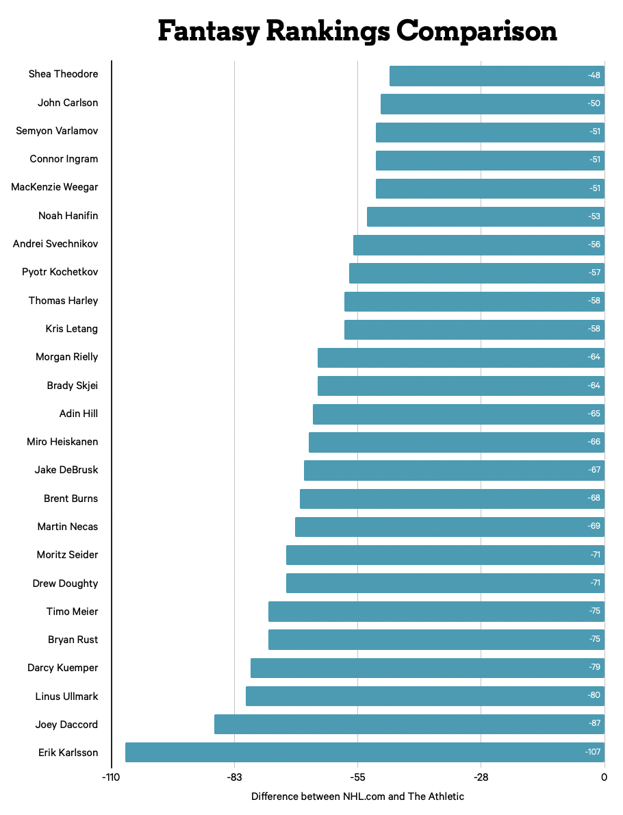ليس هناك فجوة كبيرة بين قائمة الغش الخاصة بنا وتصنيفات NHL.com فحسب، بل يوجد فرق كبير بين توقعاتنا ومتوسط موقعه في التجنيد على Yahoo.