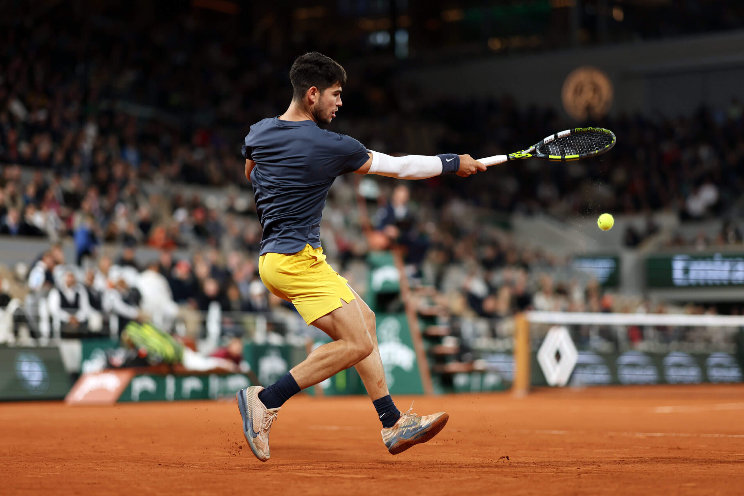 يبدو كارلوس الكاراز أقل تثبيطًا بعد إصابة ساعده. (كلايف برونسكيل / غيتي إيماجز)