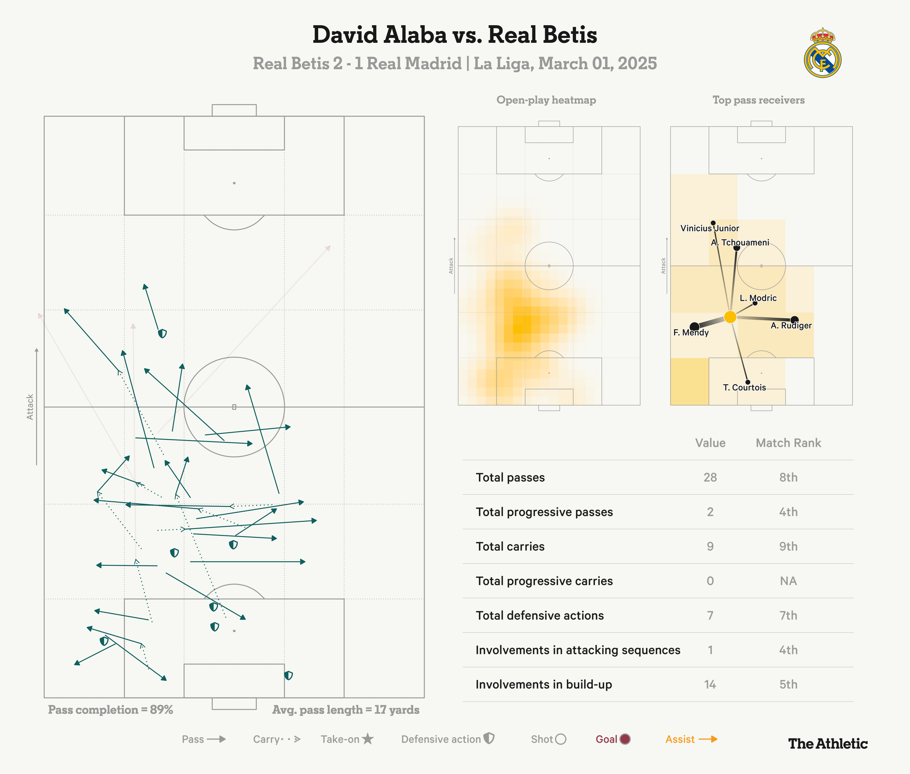 هذا يعني أن بداية Alaba ضد Betis قد تم تفسيرها من قبل البعض على أنها علامة على أنه سيكون على مقاعد البدلاء يوم الثلاثاء ، والآخرين كاختبار لمعرفة ما إذا كان جسده جاهزًا للمزيد. إذا كان هذا هو السيناريو الأخير ، فهذا ليس اختبارًا يبدو أن الوسط قد مرت.