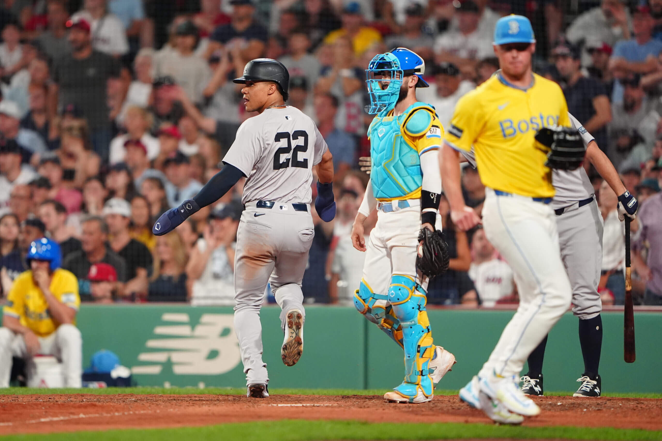 وبعد أن تقدم ريد سوكس 8-6 في الشوط السابع بفضل ثاني ضربة قوية من تايلر أونيل وضربة مزدوجة من ديفيد هاميلتون، أضاف يانكيز نقطة في الشوط الثامن قبل أن يلجأ كورا إلى كينلي جانسن في الشوط التاسع لمحاولة تأمين تقدم بنقطة واحدة. ومع وجود لاعبين خارج الملعب وعداء على القاعدة الثالثة، ضرب ترينت جريشام الكرة إلى يسار الوسط. وتراجع أونيل إلى الخلف وبدا أنه فقد الكرة، حيث ارتطمت بالحائط وسجل نقطة التعادل.