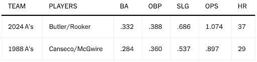 من باب المتعة فقط، قررت أن أقارن بين ثنائي أوكلاند لهذا العام وثنائي باش براذرز لعام 1988 — مارك ماكجواير وخوسيه كانسيكو — من الأول من يوليو حتى الثالث من سبتمبر. بصراحة، ليس الوقت قريبًا جدًا.