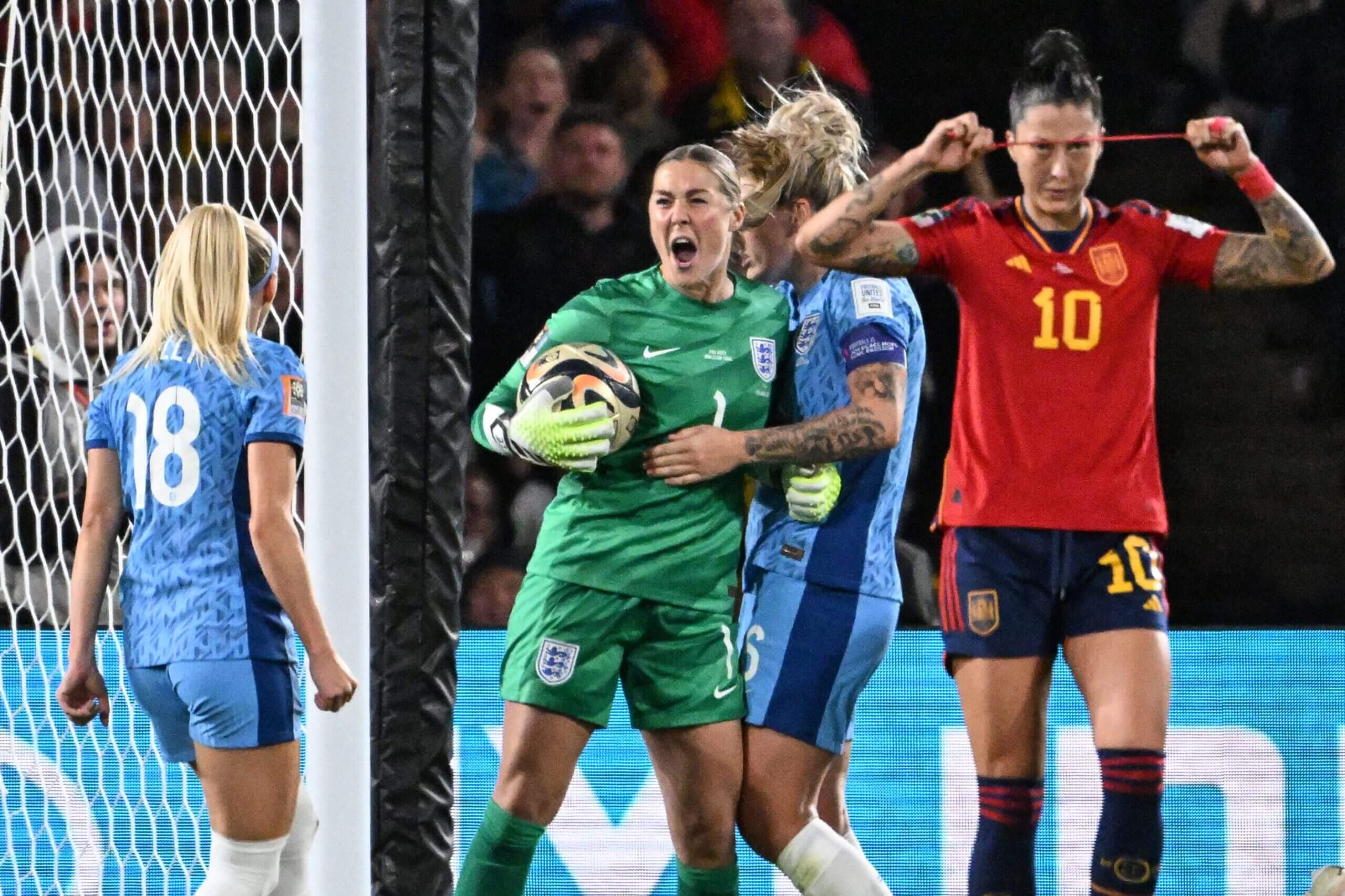 رد فعل ماري إيربس بعد أن تصدت لركلة جزاء من قبل الإسبانية جيني هيرموسو خلال نهائي كأس العالم للسيدات 2023 (وليام ويست / وكالة الصحافة الفرنسية عبر غيتي إيماجز)