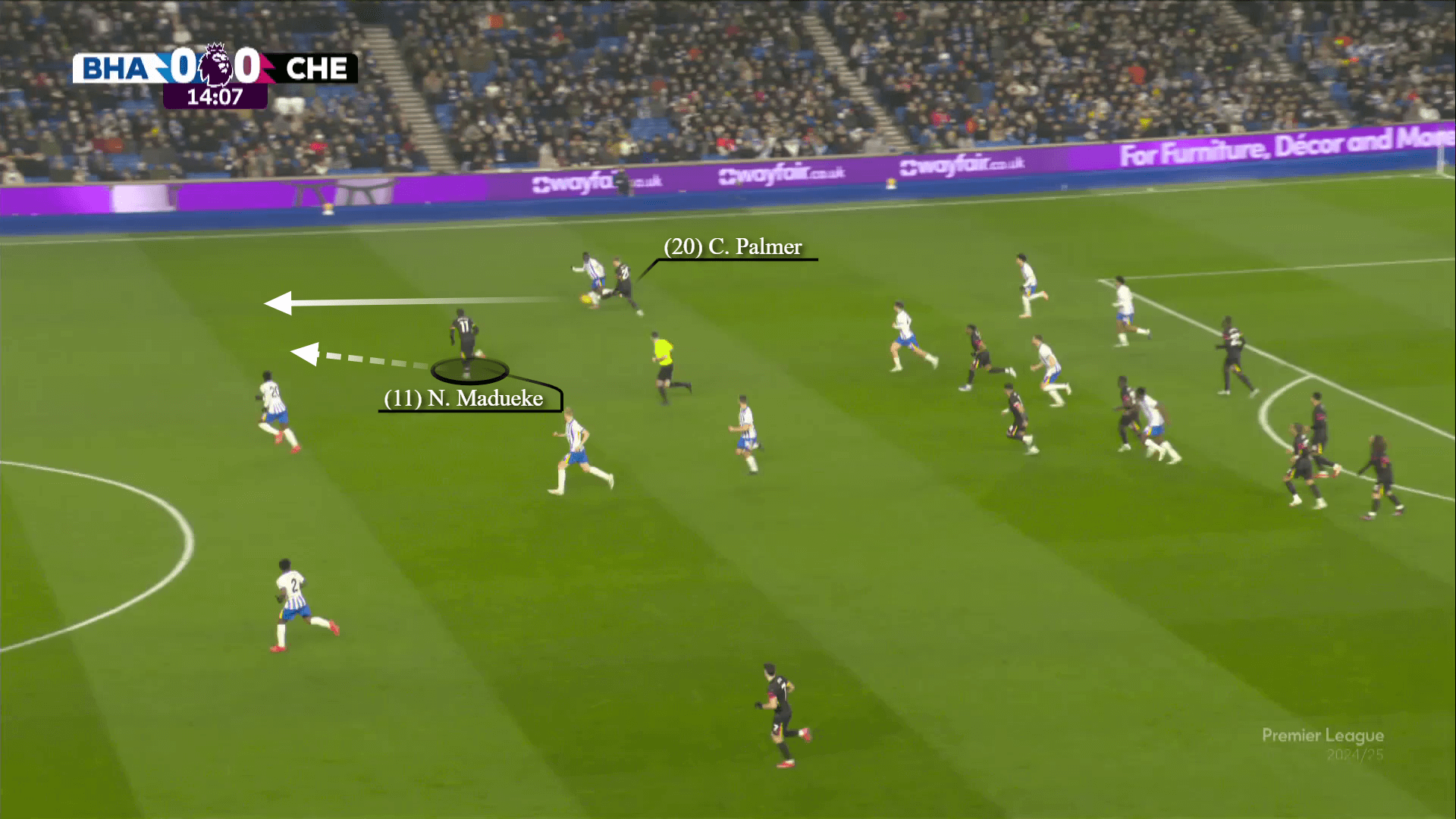 عندما حصل بالمر على الكرة ، لم يكن لديه الكثير من الفرح وبدأ الإحباط في الظهور في وقت مبكر. في هذا الانتقال من الدقيقة 15 ، يتلقى بالمر في الفضاء ويحاول إطعام Madueke ، الذي يركض في البداية باتجاه الكرة ويتعين عليه تغيير الاتجاه.