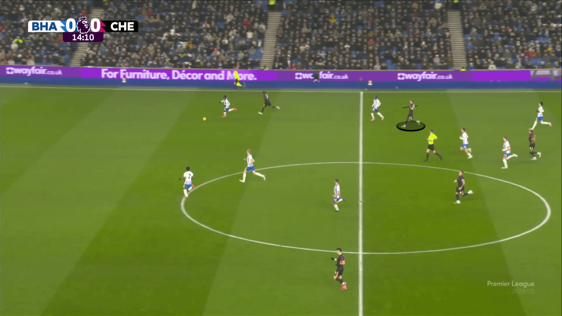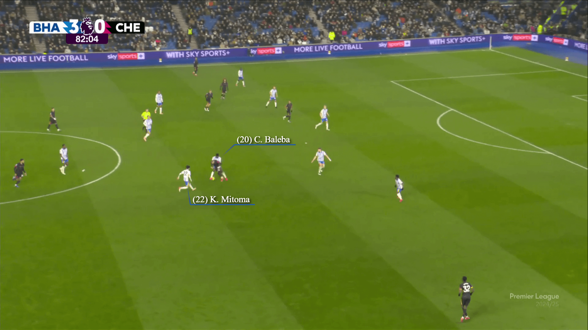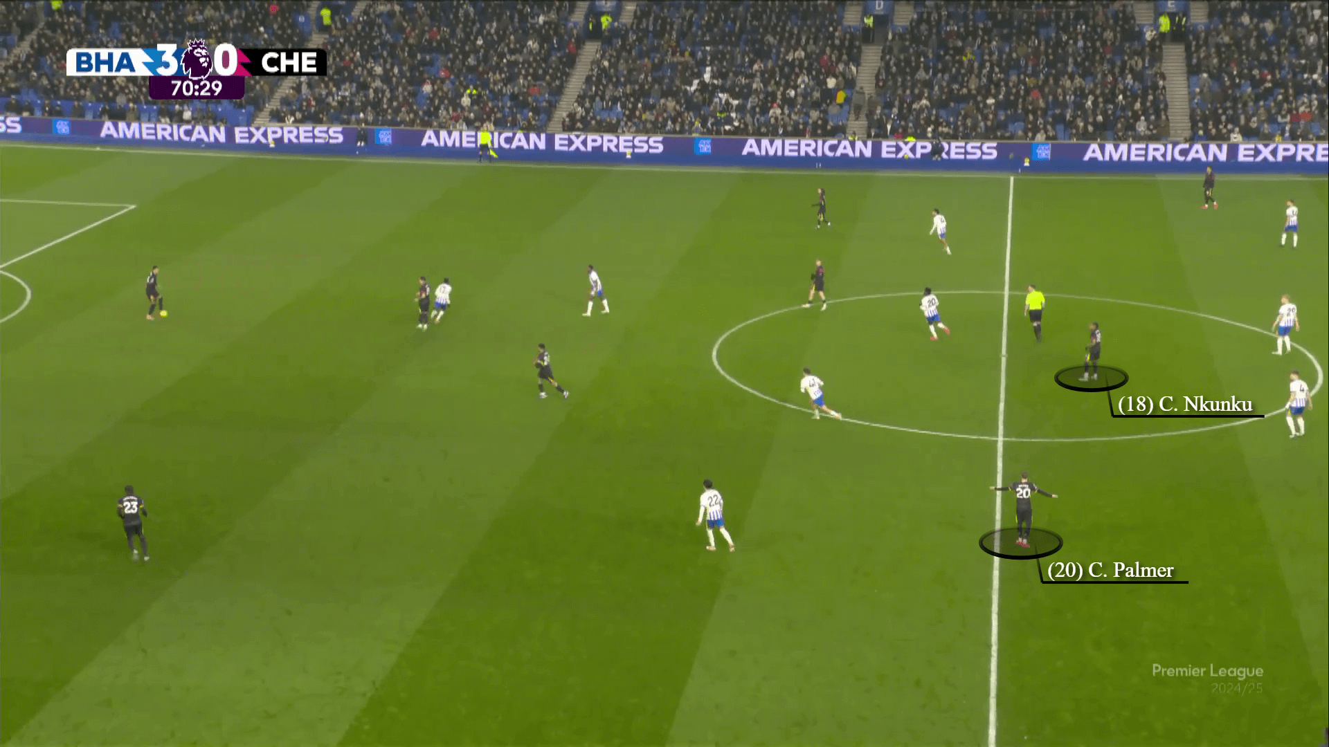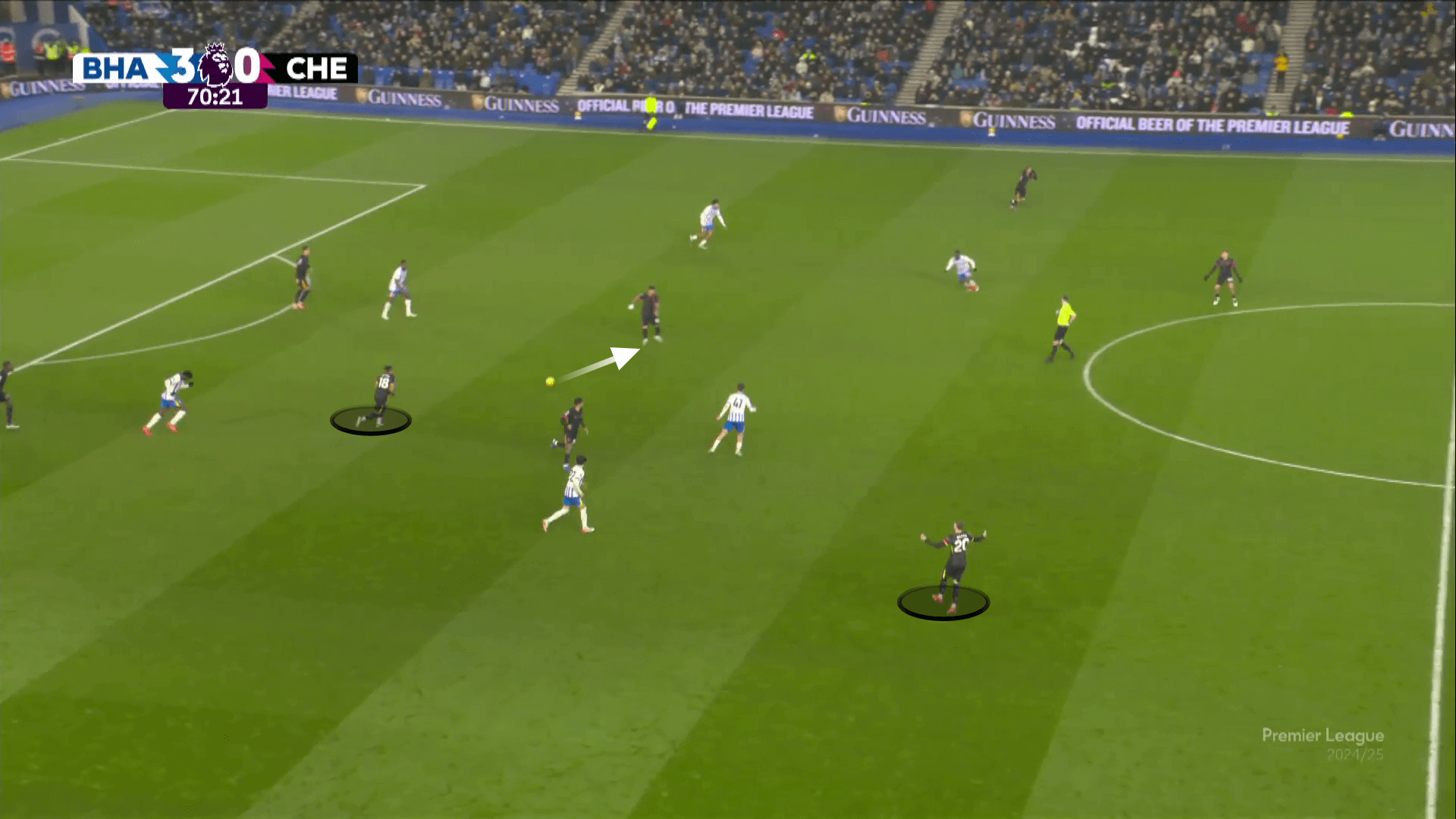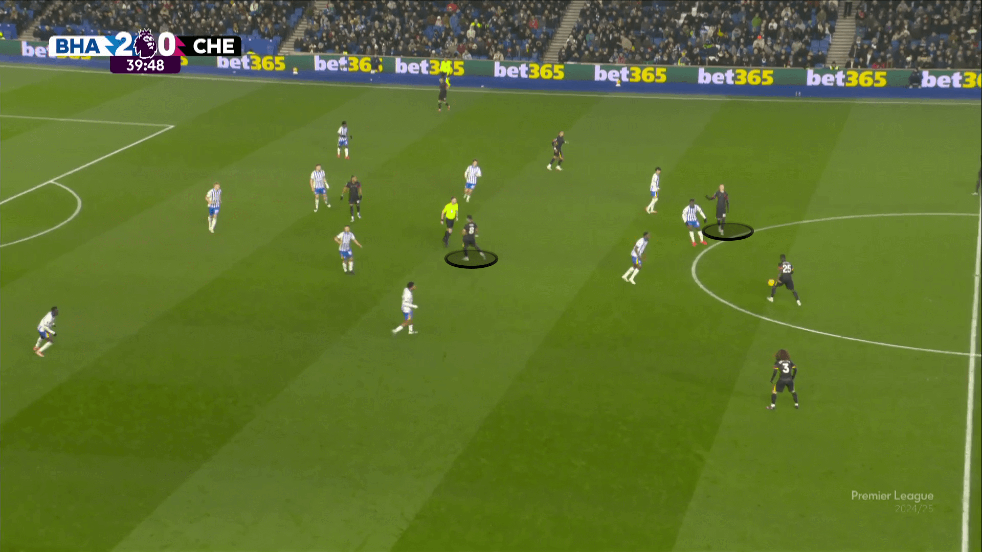 نشأت مخاوف تشيلسي عندما قام برايتون بتعديل نهجه. تم منح Van Hecke ترخيصًا للمضي قدمًا للضغط على بالمر ، حيث انجرف جويل فيتمان إلى منطقة مركزية ويلعب Minteh كأفضل الظهير الأيمن لمعالجة Pedro Neto. مع عدم وجود Nkunku في قلب دفاع برايتون ويفضل البقاء أقرب إلى النوني اليميني نوني مادويك ، سمح لبرايتون بالحد من تمريرات تشيلسي إلى بالمر. كانت اللمسات الـ 20 في الشوط الأول هي ثالث أكثر اللمسات التي سجلها في النصف في الدوري هذا الموسم.