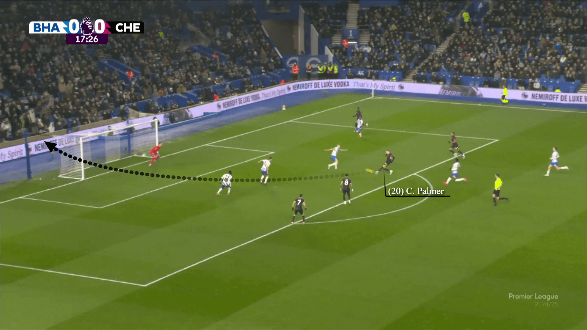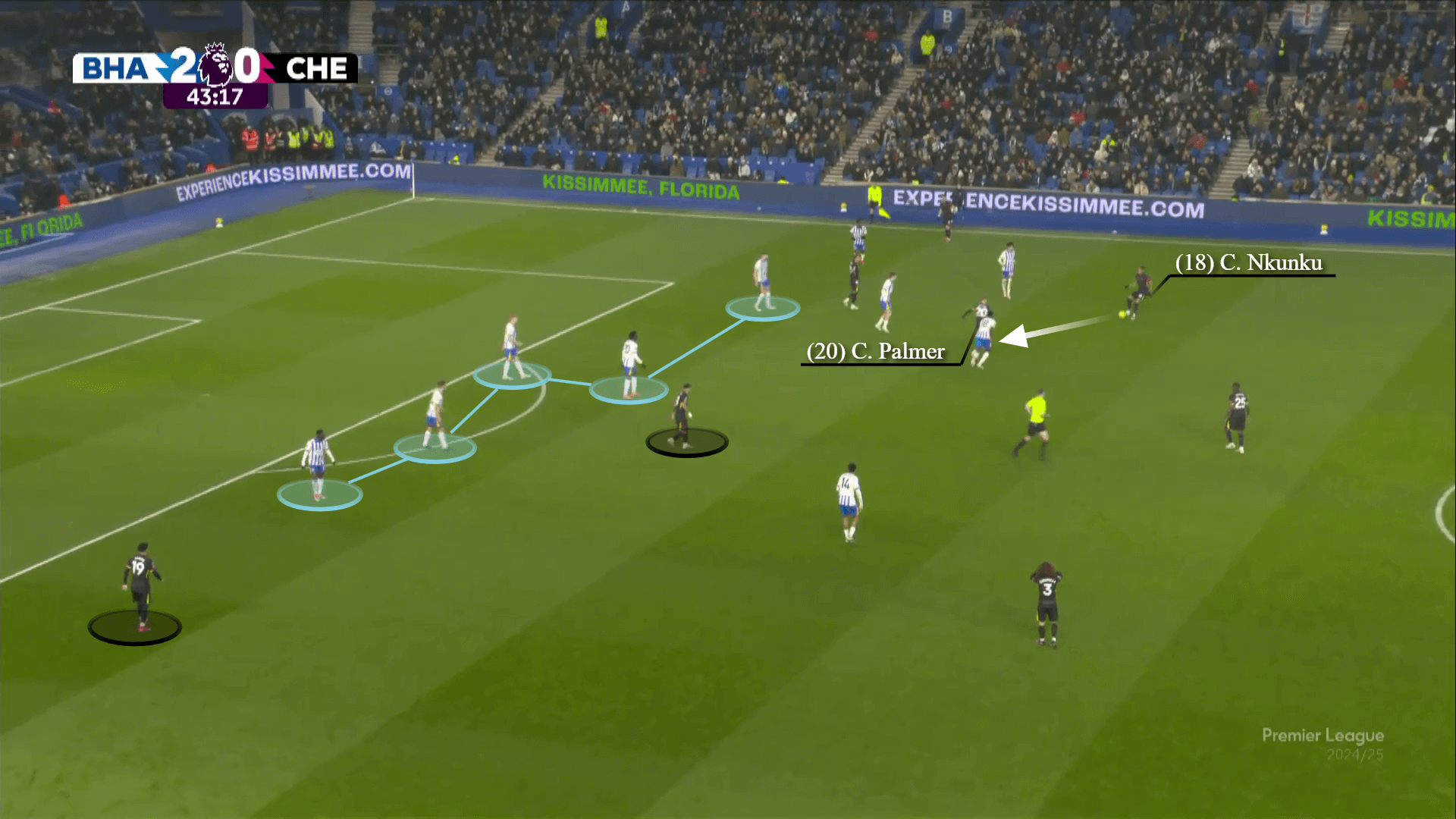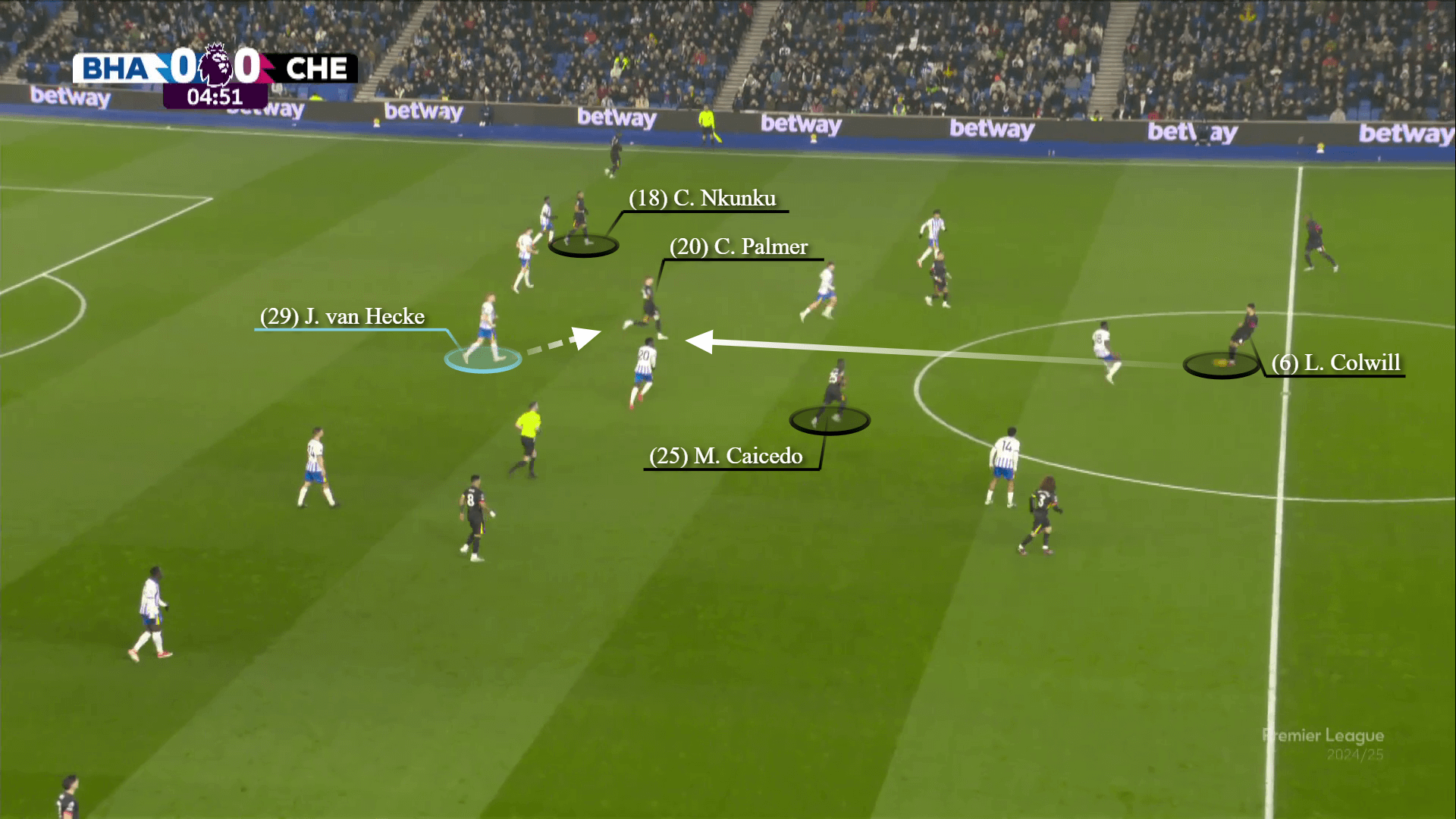 في الدقيقة الخامسة ، كانت الرؤية واضحة. يلعب Colwill تمريرة كسر خط إلى بالمر ، الذي يسقط بعمق لسحب جان بول فان هيك من خط برايتون الخلفي.