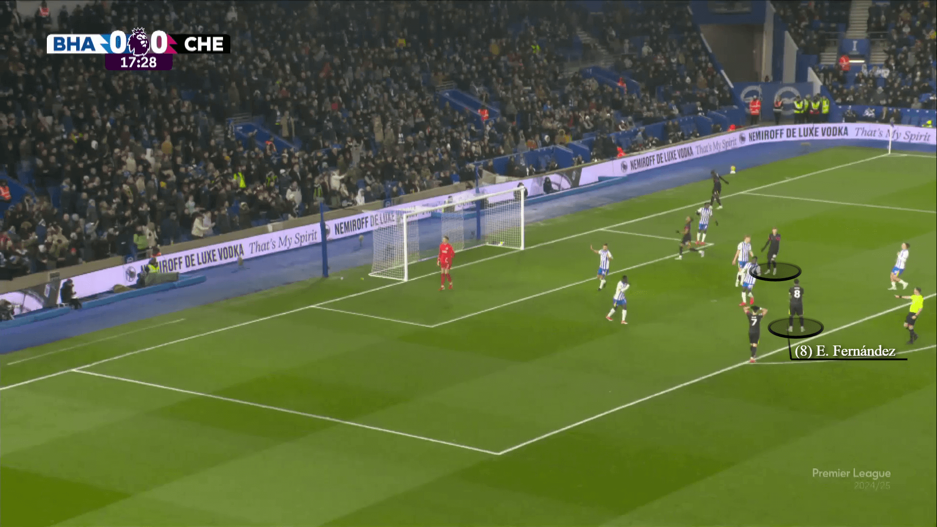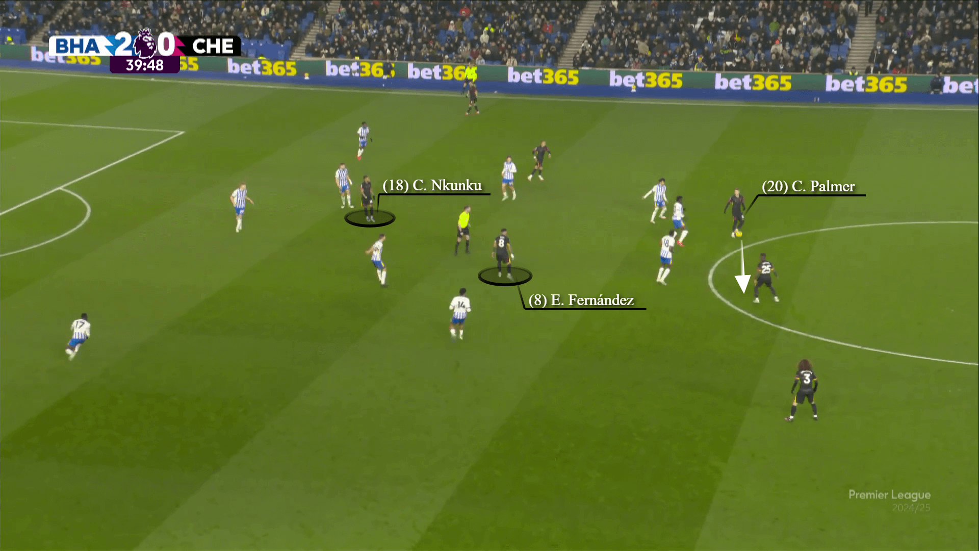 أوقف هذا أي فرص لإضرار تشيلسي برايتون مع كرات فوق الجزء العلوي من الوسط. كما تسبب في المزيد من الإحباط كما بعد مرور بالمر إلى كايوسيدو ، فرنانديز ، الذي وضع نفسه بين المدافعين ، يبعث على الغضب كما يعترف به بالمر بيد مرتفعة.